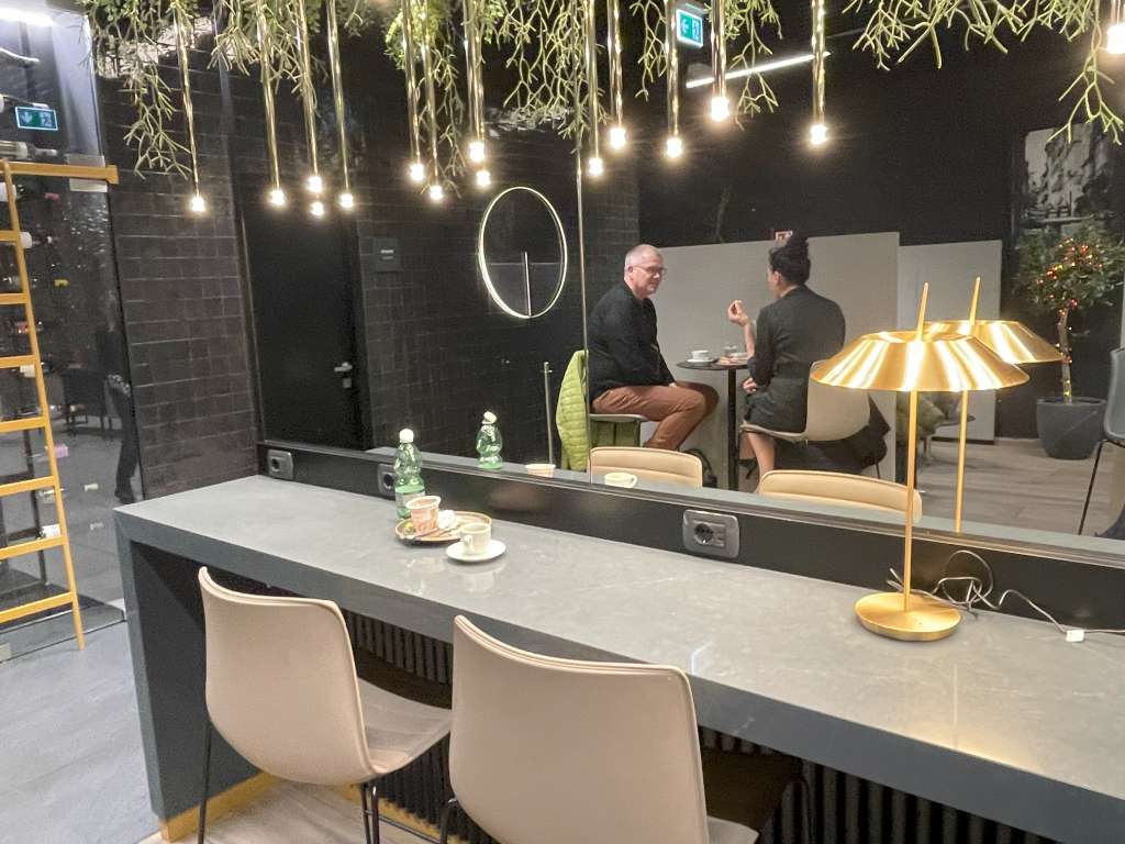 Man kann es nicht anders beschreiben: Die Lounge ist wirklich klein. Als ich die Räume morgens besuchte, war es bereits brechend voll und die vielen Gäste verteilten sich auf den kleinen, zentralen Hauptbereich sowie die durch Raumteiler abgetrennten Separees links und rechts davon.