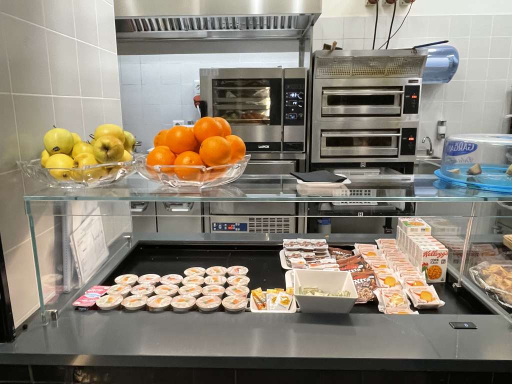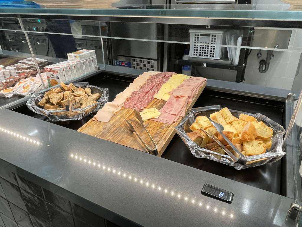 Das Büfett mit Speisen befindet sich im linken Teil der Lounge. Während meines Besuchs gab es ein kleines Frühstücksbüfett mit Croissants und Brot sowie Wurst- und Käseaufschnitt. Ergänzend wurden Joghurt, Obst und Cerealien angeboten. Als warme Optionen standen Rührei mit Speck und gekochte Eier zur Verfügung. Kein beeindruckendes Angebot, aber auch nichts, über das man hätte meckern können.