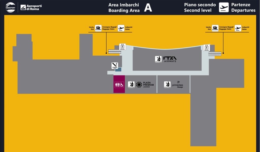 Auf der Orientierungskarte des Flughafens Rom-Fiumicino ist die Prima Vista Domus Lounge nicht eingezeichnet. Auf dieser Karte würde sie sich jedoch links von der Plaza Premium Lounge befinden: