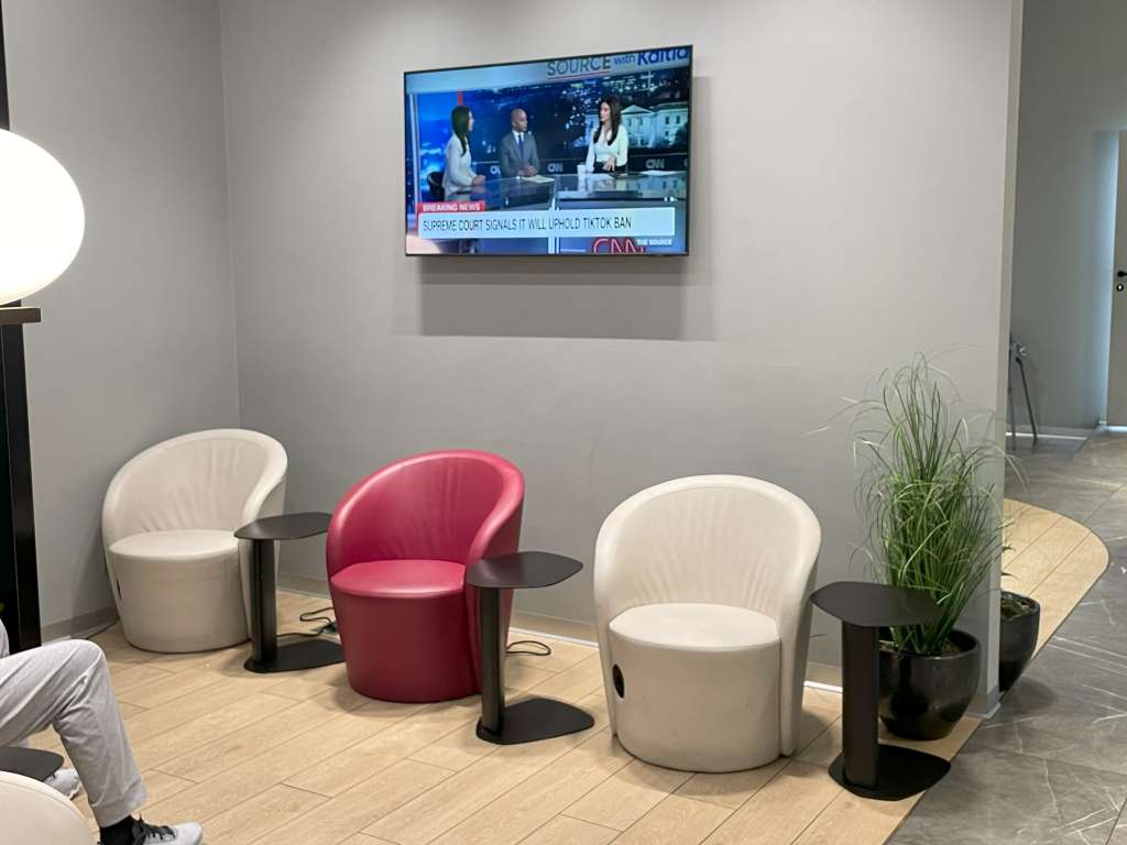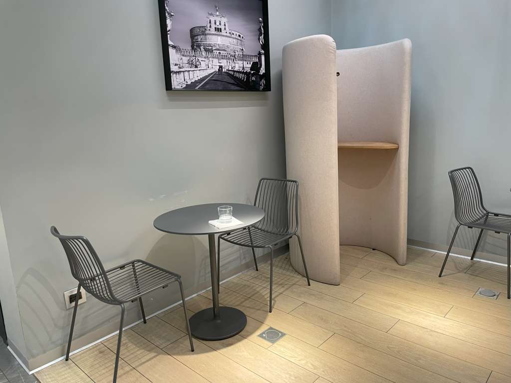 Die Primeclass Lounge in Rom-Fiumicino erstreckt sich über 410 Quadratmeter und bietet genügend Platz, um sich vor dem Flug wohlfühlen. Schon beim Betreten fällt die klare Struktur auf: Abfluginformationsanzeigen und ein großer TV-Bildschrift sind vorhanden, um Reisende auf dem Laufenden zu halten, während Zeitungen und Zeitschriften für Unterhaltung sorgen. Das kostenlose WLAN ist zuverlässig und ermöglicht eine schnelle Verbindung, ideal für letzte Arbeitsaufgaben oder Kontaktaufnahme.