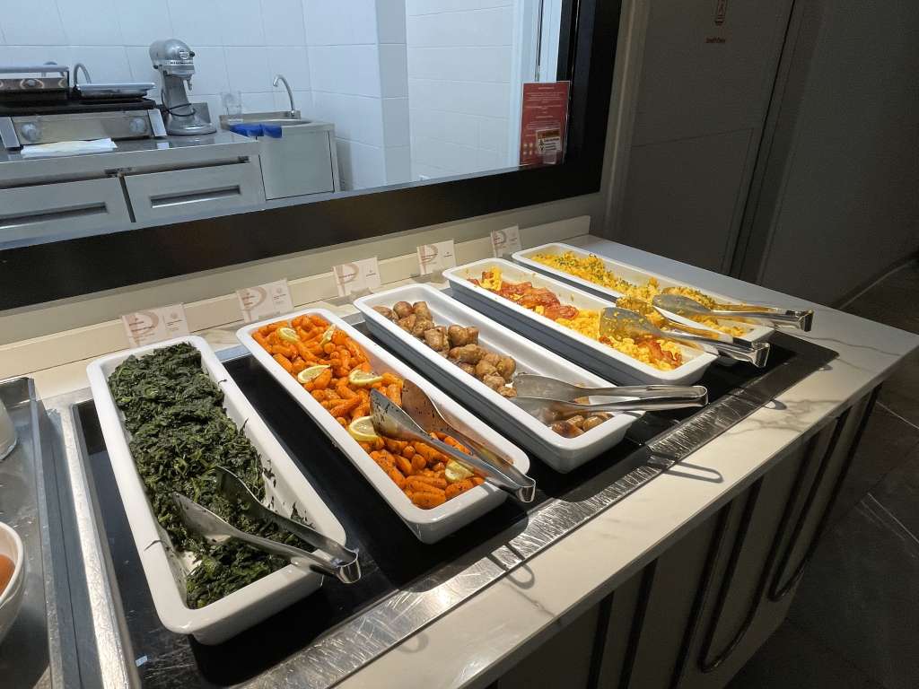 Die Primeclass Lounge in Rom-Fiumicino überzeugt mit einer abwechslungsreichen Auswahl an Speisen und Getränken, die Vielfliegern den Aufenthalt verschönert. Das Buffet bietet eine solide Palette an Optionen: Frisches Obst wie Äpfel, Birnen und Orangen sorgt für eine leichte Verpflegung, während Brote, Brötchen und belegte Sandwiches für eine herzhafte Stärkung sorgen. Warme Gerichte wie gebratene Gemüse, Fleischbällchen und Spinat runden das Angebot ab – alles sauber präsentiert und leicht zugänglich. Ein separater Bereich mit Käse, Wurst und Oliven fügt eine mediterrane Note hinzu, und ein Getränkekühlschrank mit Softdrinks, Säften und Joghurts rundet die Auswahl ab.