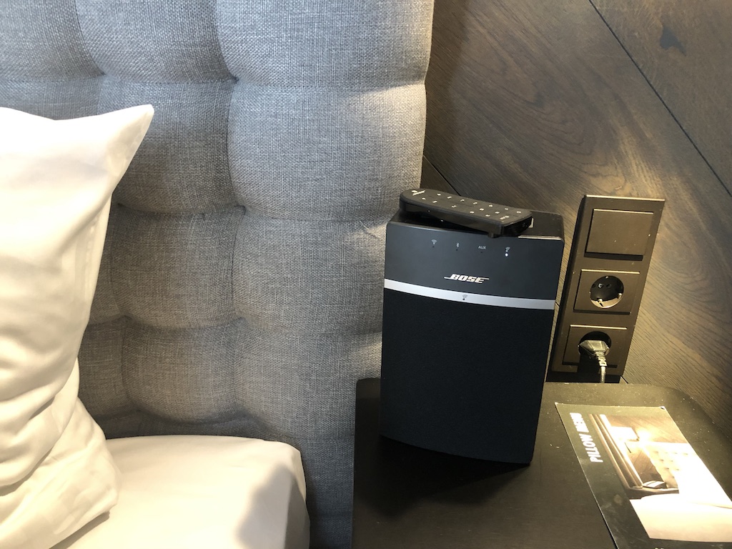 Im Mittelpunkt des Zimmers stand das große Bett. Der Bose-Lautsprecher machte einen leistungsfähigen Eindruck, leider konnte ich diesen nicht nutzen. Neben dem Bett waren je ein Sessel und die Minibar mit Wasserkocher und Espressomaschine. Kaffee und Tee steht den Gästen kostenlos zur Verfügung, für die anderen Getränke und Snacks waren die üblichen Tarife fällig.
