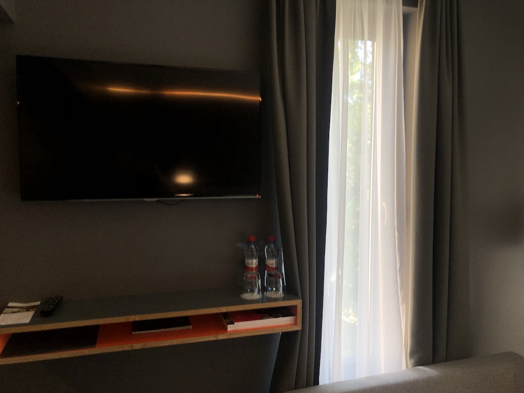 Gegenüber vom Bett waren ein weiteres Fenster, Fernseher und ein Sofa. Wir missbrauchten dieses später als Gepäckablage, da der Platz im Zimmer sonst limitiert war.