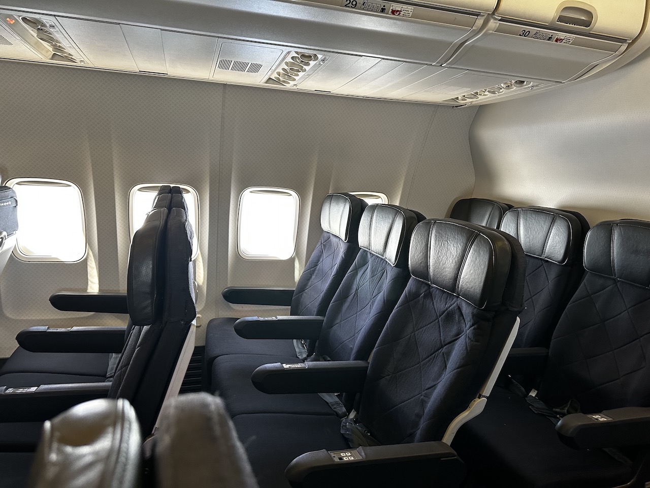 Auch auf kleineren Maschinen wie der Embraer oder Boeing 717 ist eine fest installierte Business Class zu finden, in der B737-800 sind drei Reihen und insgesamt 12 Sessel eingebaut. Es folgt die Economy Class in der 3-3 Bestuhlung, wobei es im hinteren Bereich etwas enger wurde.