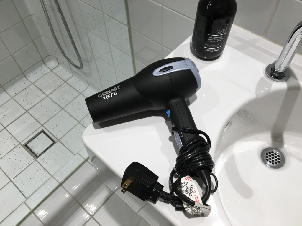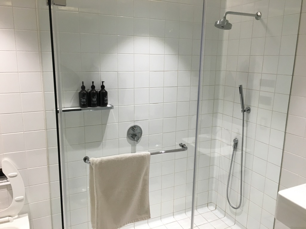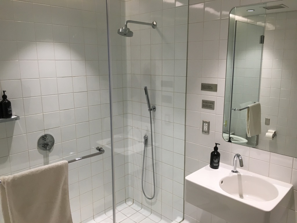 Die Qantas First Class Longe in Los Angeles verfügt auch über eigene Duschen und Toiletten. Die Duschen selbst sind angenehm groß, sauber und gut belüftet. Allerdings bin ich kein Fan der Duschamenities in den großen Spendern. Ich bevorzuge in einer First Class Lounge doch kleine Flaschen, wie in einem Hotel. Ansonsten kann man natürlich alles, vom Fön über die Zahnbürste, bis zum Rasierer in den Duschräumen nutzen.