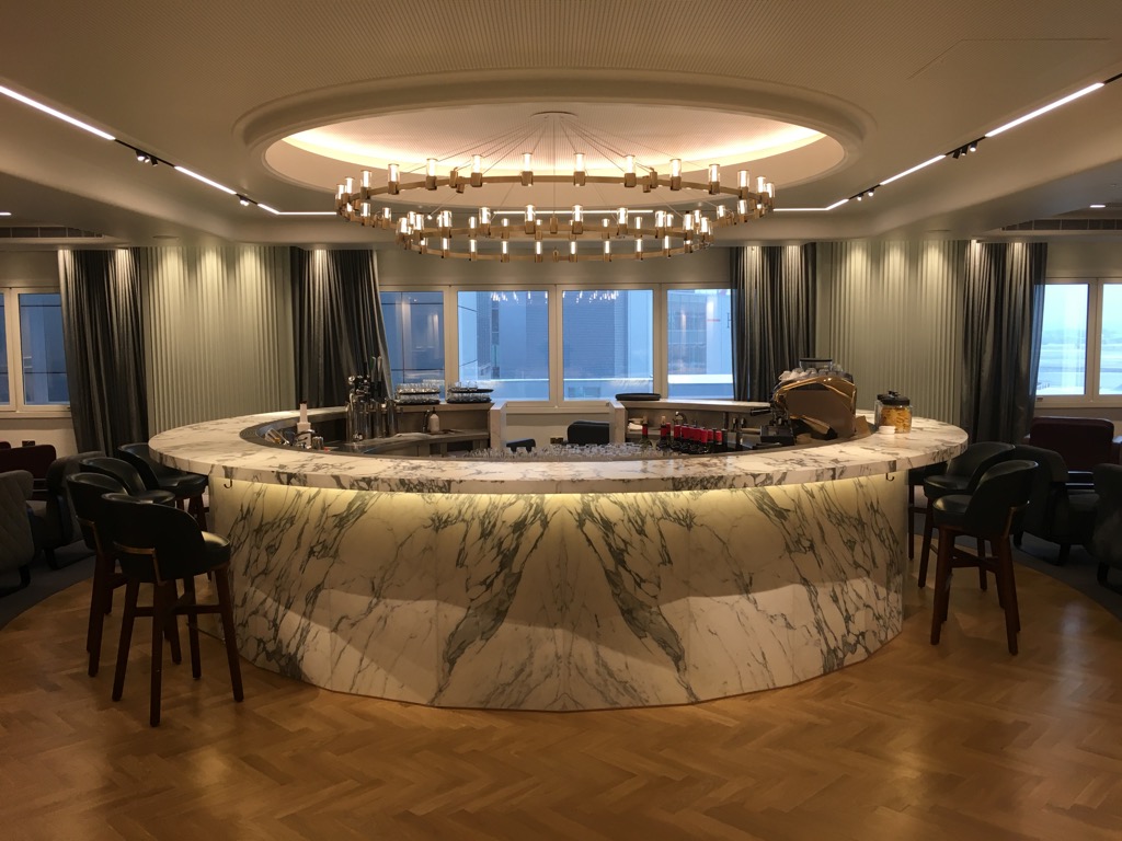 Die eigentliche Lounge befindet sich im Obergeschoss. Man erreicht sie entweder über eine Treppe oder über einen Fährstuhl. Spätestens beim Hinauflaufen der Treppe und dem anschließenden Blick auf die Marmorbar im Obergeschoß, ließen bei mir unweigerlich Gedanken an die Titanic aufkommen. Auch wenn es ein wenig weit hergeholt ist, aber ich habe diesen Film zum ersten Mal an Bord eines Qantas Fluges gesehen, möglicherweise drängte sich daher auch die Assoziation auf.