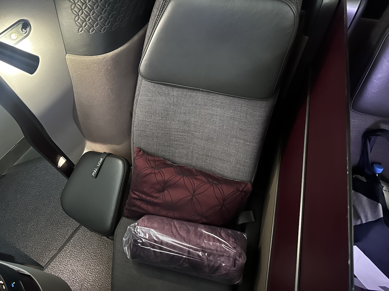 Auf dem Flug gab es zwar kein Amenity Kit oder Pyjama, am Sitz lagen aber Dinge wie Kissen, Decke, Wasserflasche, Kopfhörer und Menükarten.