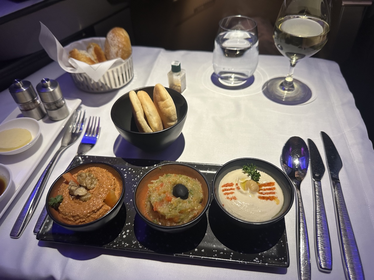 Wie fast immer wurden wir persönlich begrüßt, es gab eine kurze Sitzeinweisung und die Frage nach dem Welcome Drink. Dieser wurde dann mit Dattel und arabischem Kaffee serviert.