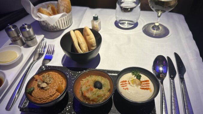 Wir sind schon häufiger in den Q-Suites geflogen und haben Euch in anderen Reviews die Sitze sowie die markante Kabine genauer vorgestellt. Qatar Airways nutzt das Produkt auch auf Kurzstrecken und tischt auch hier ordentlich auf. Der Flug nach Kairo war vom Start bis zur Landung ein weiteres gelungenes Erlebnis mit der oneworld-Airline.