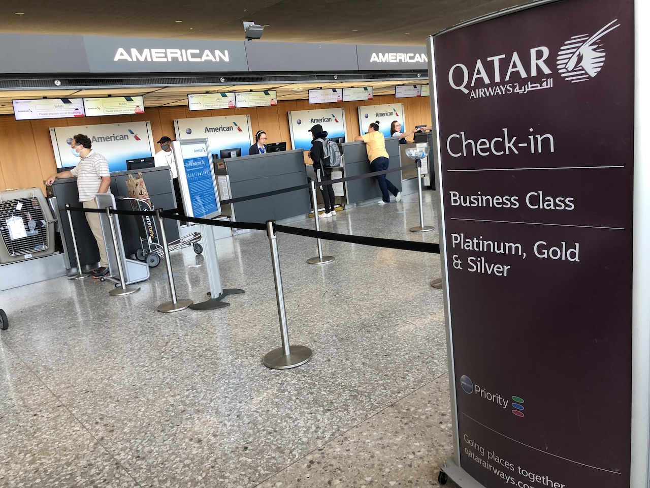 Die Check-In Schalter von QR sind direkt neben dem oneworld-Partner American Airlines, Statuskunden des Privilege Club oder einem oneworld Status können – wie Business Class Passagiere auch – am gesonderten Schalter einchecken. Wir konnten den Online Check-In nicht nutzen, hatten aber kein Gepäck zur Aufgabe und am Schalter war niemand vor uns. Daher standen wir schon 5 Minuten nach der Ankunft am IAD mit den Bordkarten in der Hand an der Sicherheitskontrolle.