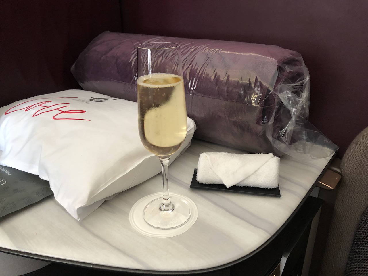 Die Flugbegleiter stellen sich fast immer noch am Boden bei den Gästen in ihrem Bereich vor, erklären den Sitz und fragen Getränkewünsche ab. Kissen, Decke, Desinfektionsset und Speisekarten waren bereits am Sitz, ein Amenity Kit, Slipper und Schlafanzug wurden gesondert gebracht.
