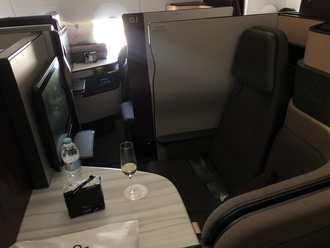Wir saßen auf 12D & 12G im zweiten Compartment der Business Class. In diesem Bereich sind lediglich acht Sitze untergebracht. Die Anordnung ist durch die Trennwände etwas verschachtelt, das Raumgefühl war trotzdem – oder gerade deswegen richtig gut.