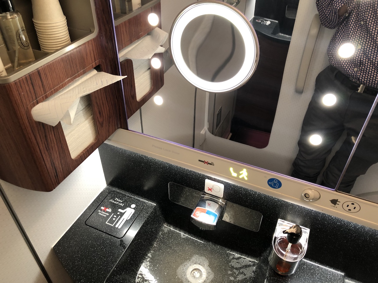 Im Waschraum erkennt man meist gut das Alter eines Flugzeuges, dieser war entsprechend modern ausgestattet, sauber und mit Komfortartikeln bestückt.