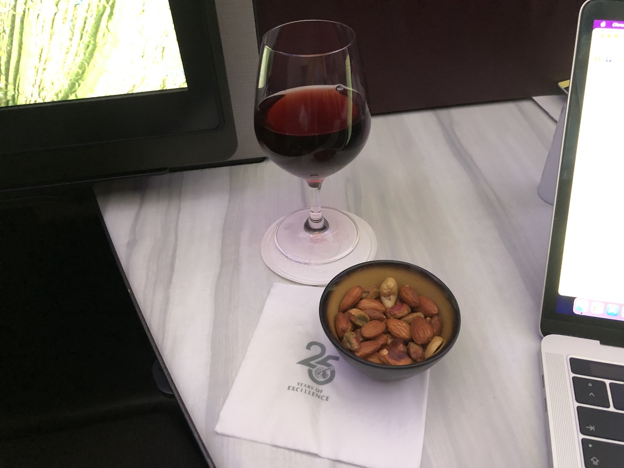 Qatar bietet einen exzellenten Service in der Business Class, Gäste können aus einer umfangreichen Karte wählen und den Zeitpunkt der Mahlzeiten selbst festlegen. Bei solch langen Strecken hatten wir die Möglichkeit zwei volle Servicegänge zu ordern und zusätzlich teilweise warme Snacks zu bekommen. Die Amenities sind umfangreich, das Internet fair bepreist und das Entertainment breit sortiert.