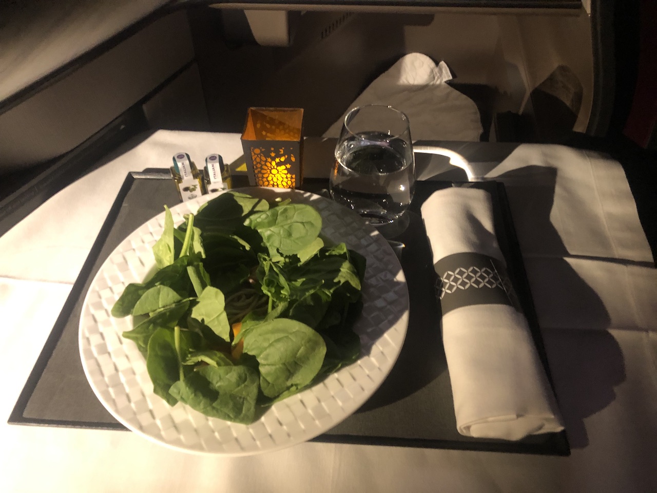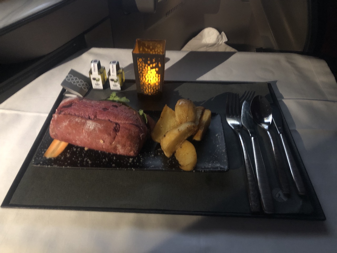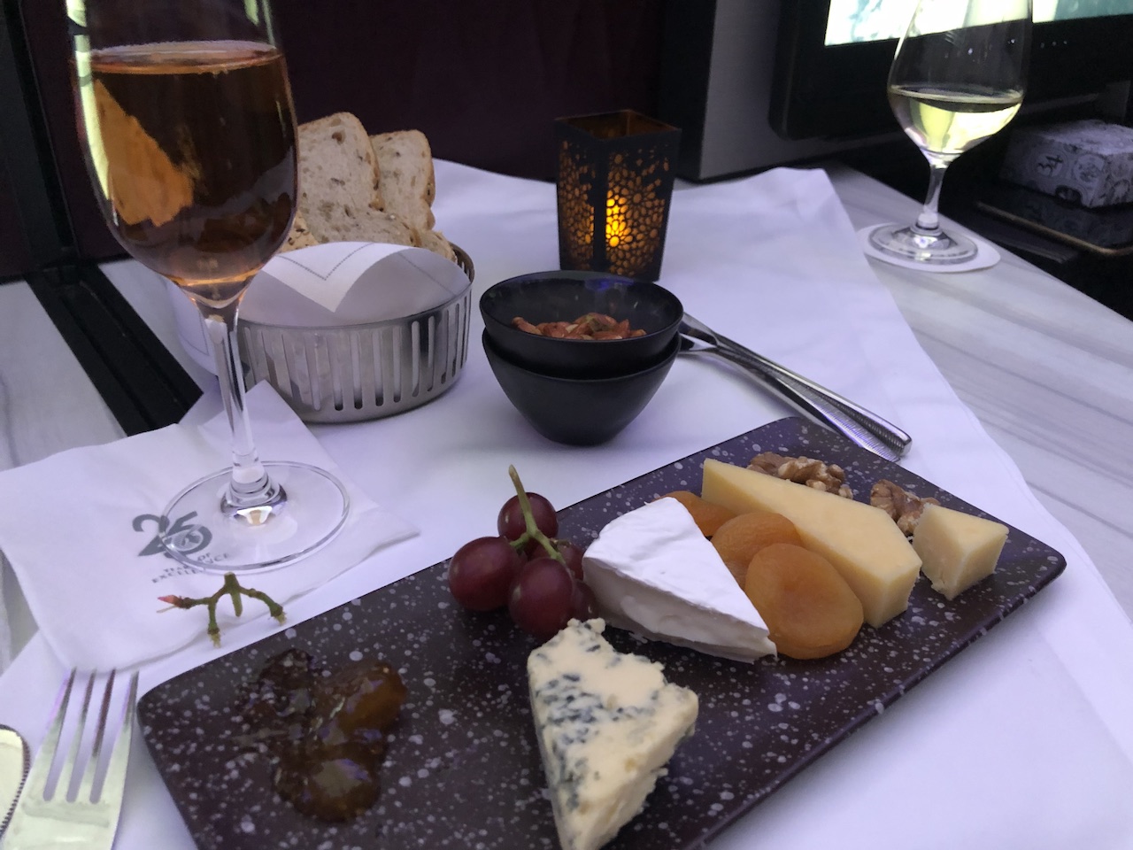 Nach dem Start gab es zunächst ein Aperitif mit Nüssen, später haben wir uns eine kleine Käseplatte geteilt. Fluggäste können den Zeitpunkt für die Mahlzeiten individuell festlegen. Wir haben erst einige Stunden nach dem Start Vorspeise, Suppe und die Hauptgänge bestellt.