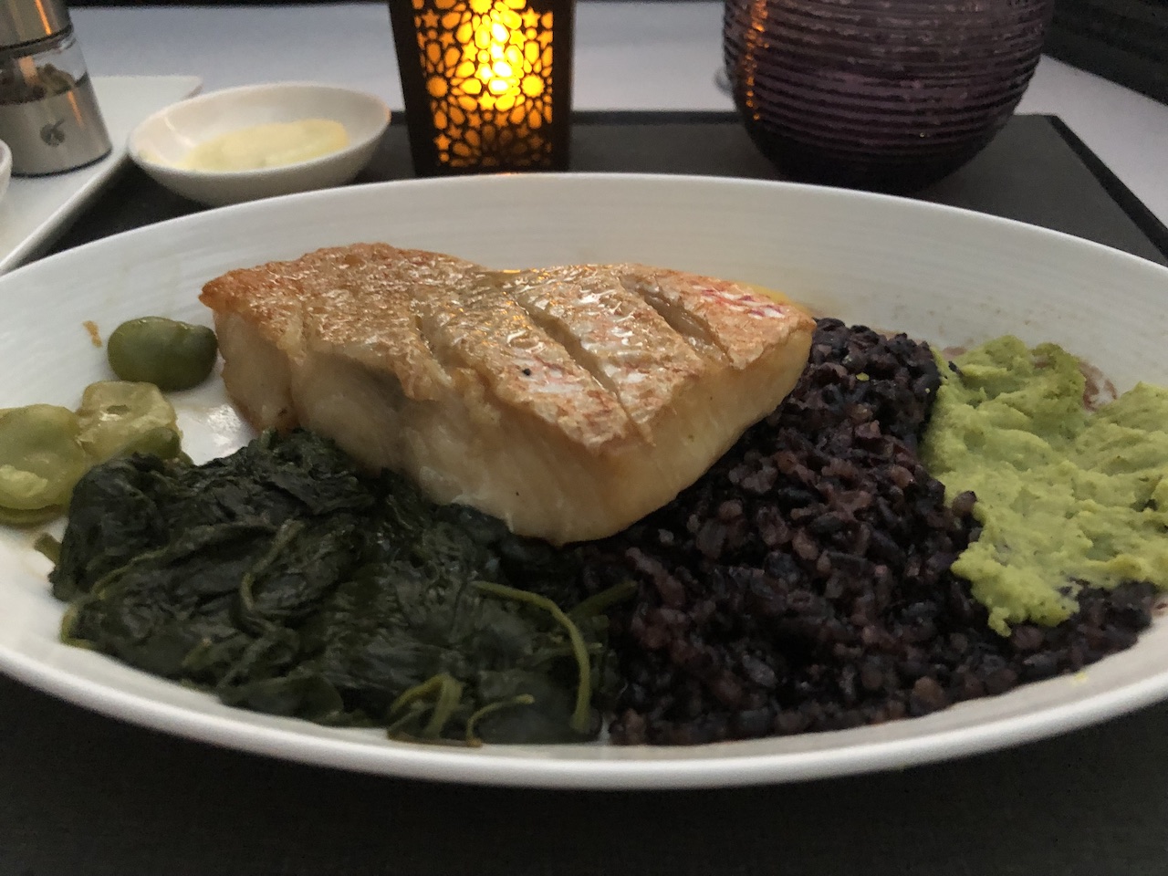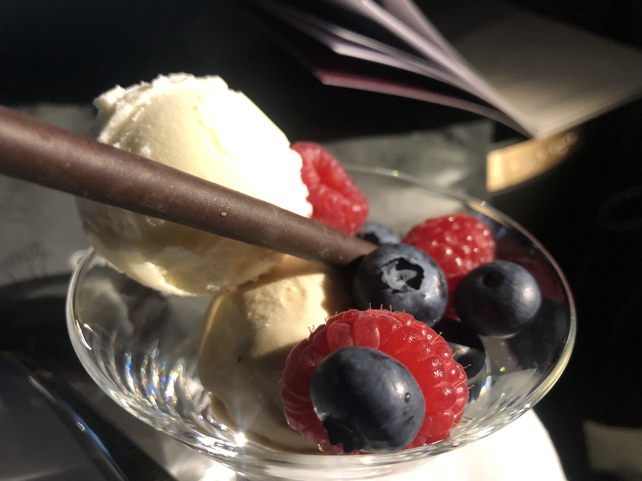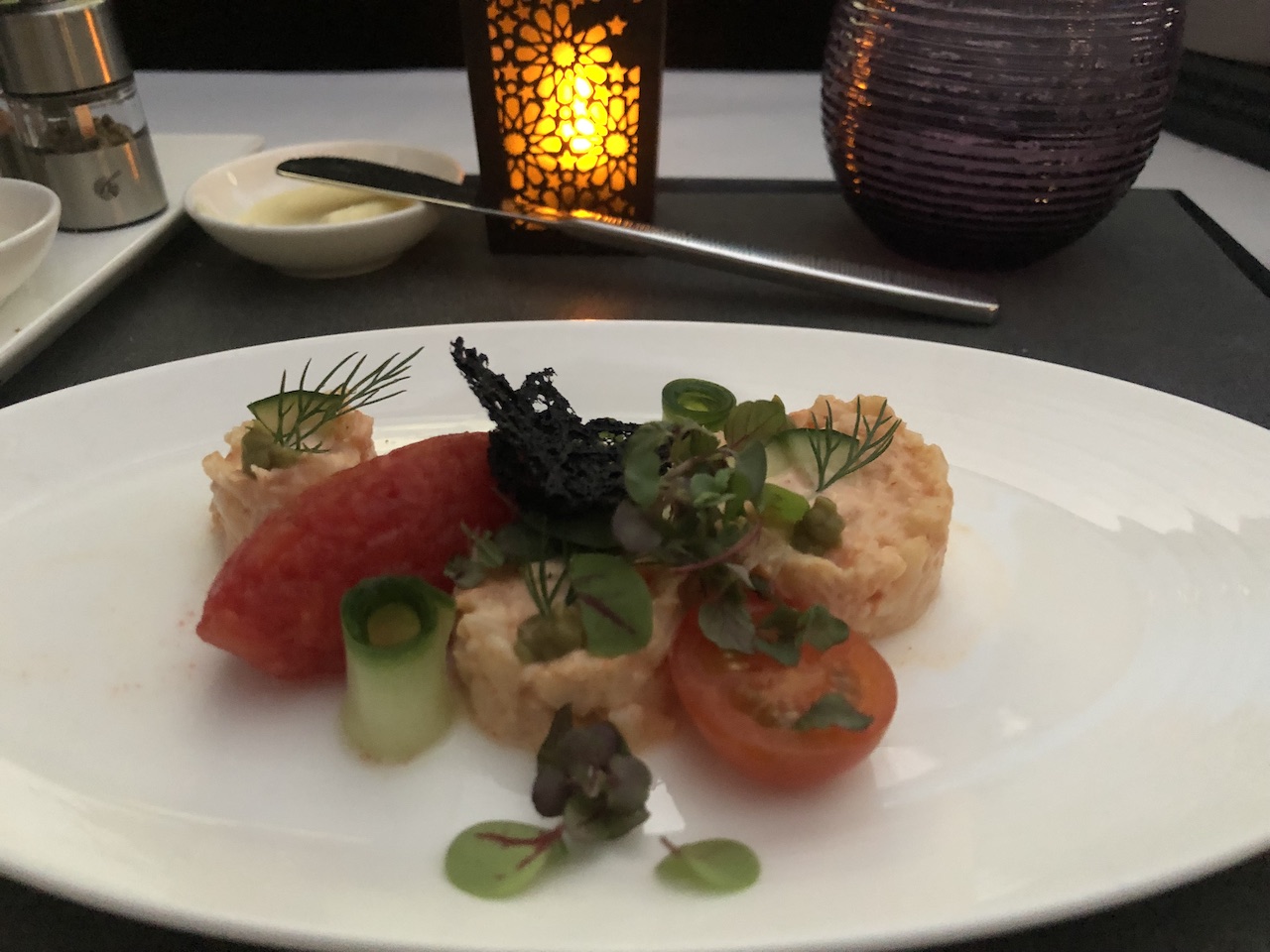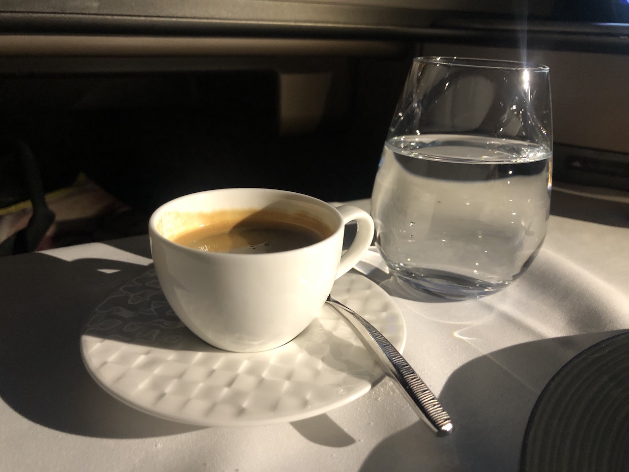Nach dem Start gab es zunächst ein Aperitif mit Nüssen, später haben wir uns eine kleine Käseplatte geteilt. Fluggäste können den Zeitpunkt für die Mahlzeiten individuell festlegen. Wir haben erst einige Stunden nach dem Start Vorspeise, Suppe und die Hauptgänge bestellt.