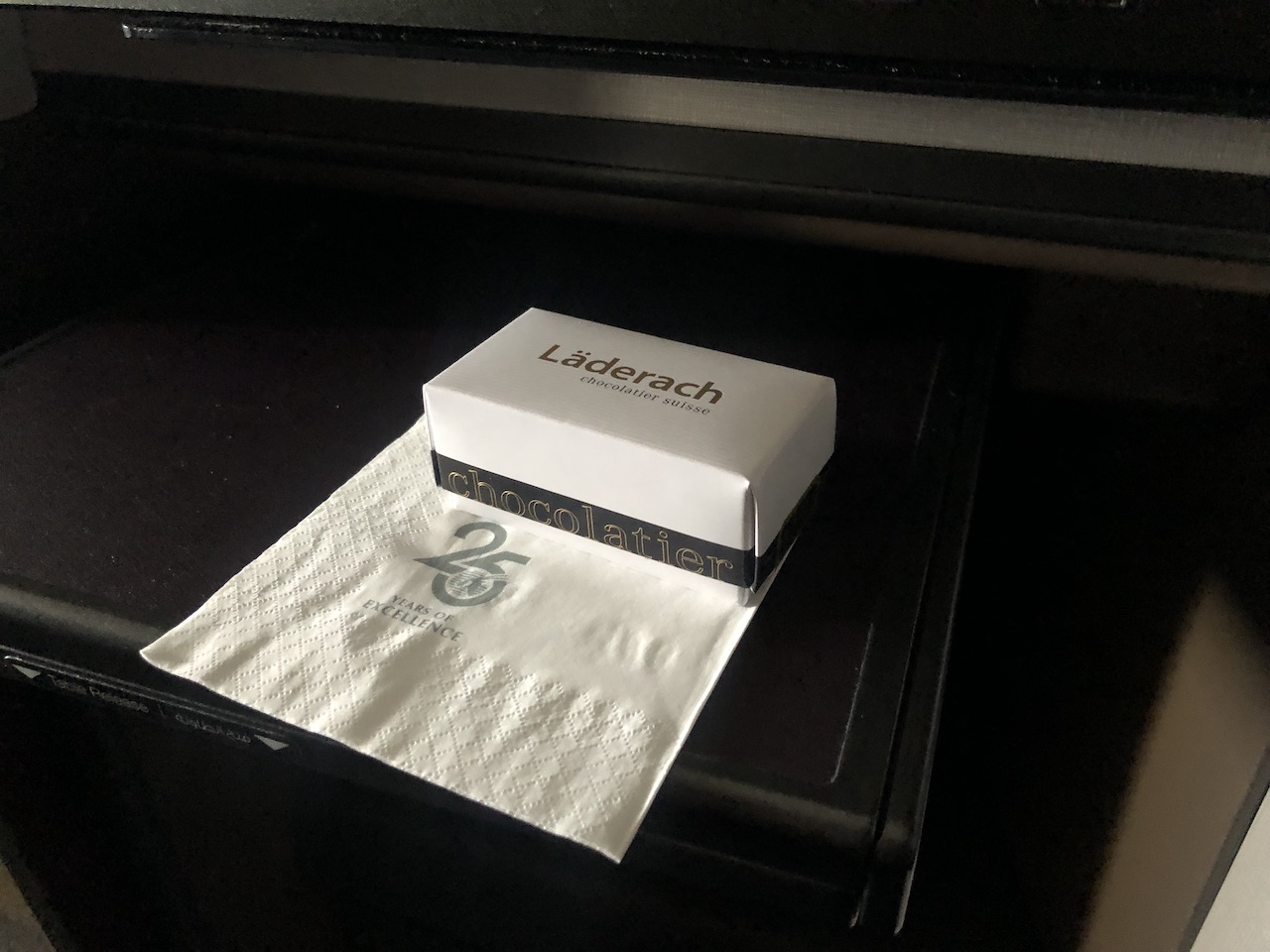 Kurz vor der Landung gab es noch Pralinen und ein abgepacktes Erfrischungstuch. Wir erreichten Doha überpünktlich und konnten ohne Pass- und Sicherheitskontrolle zum Anschlussflug.