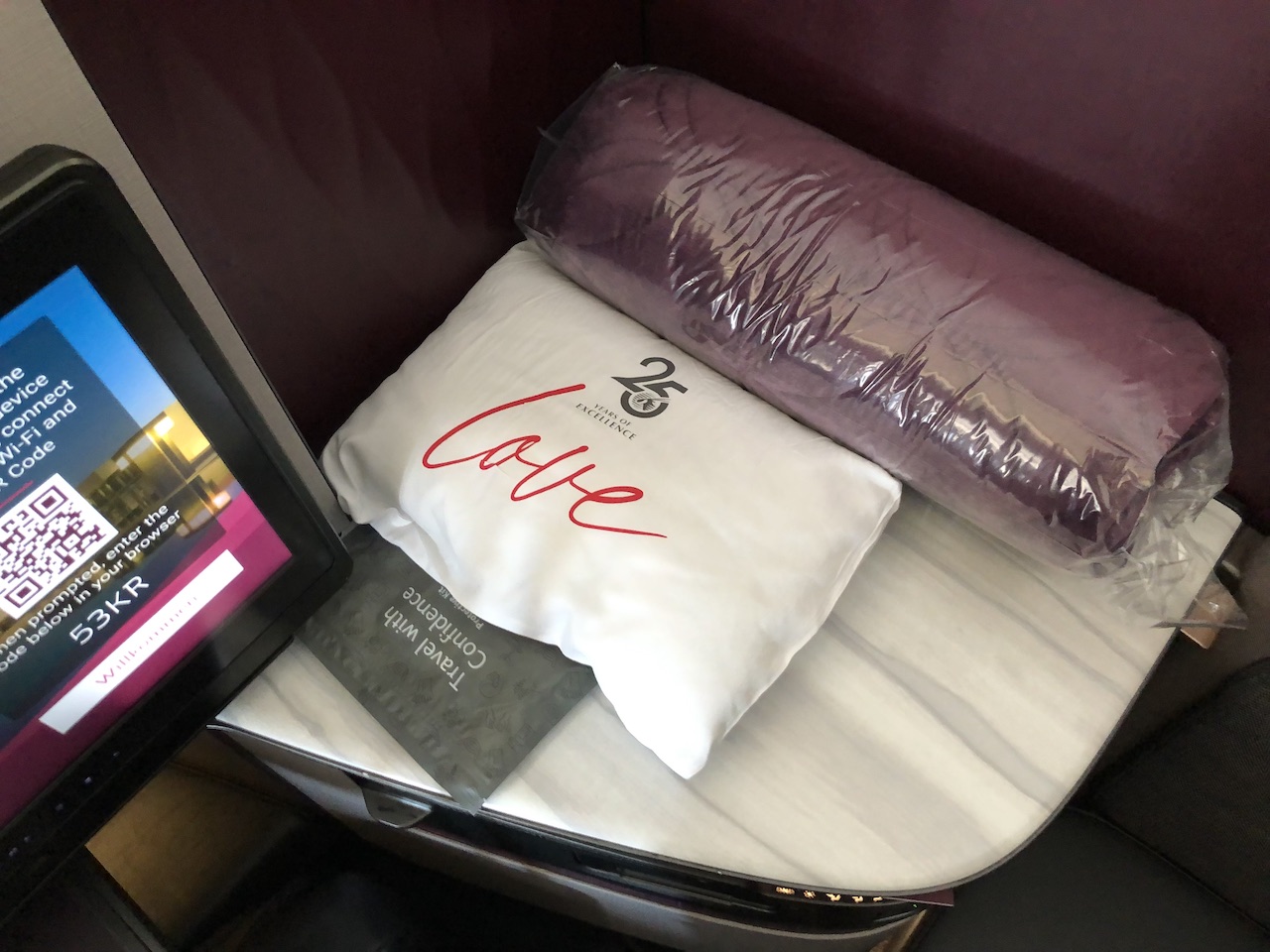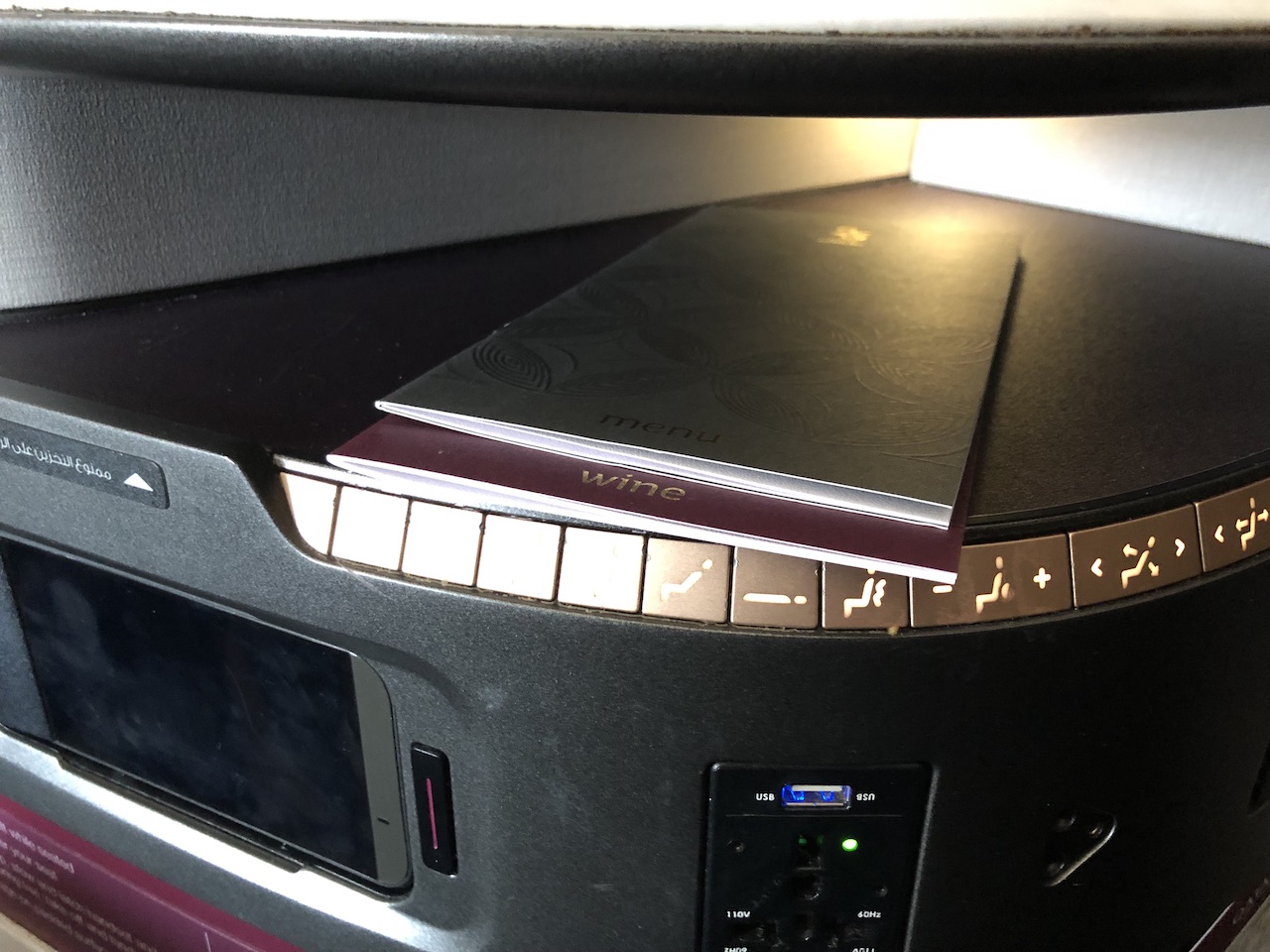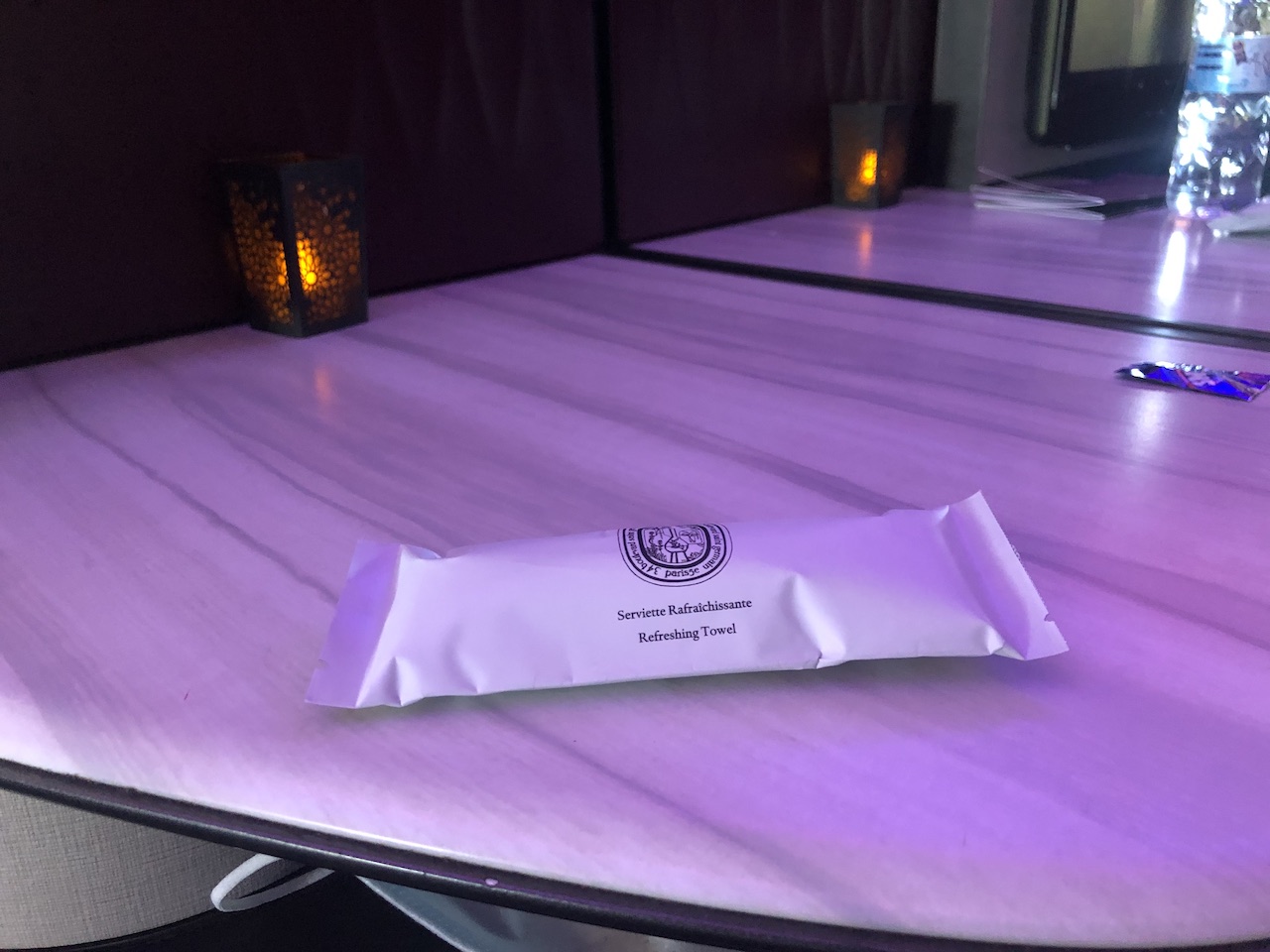 Moodlight und indirekte Beleuchtung sind ein absoluter Pluspunkt und kamen auch heute wieder sehr gut zur Geltung. Direkt hinter unseren Plätzen war eine Trennwand zur Economy Class, eine Zwischenklasse gibt es bei Qatar (noch) nicht.