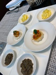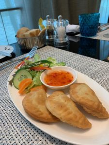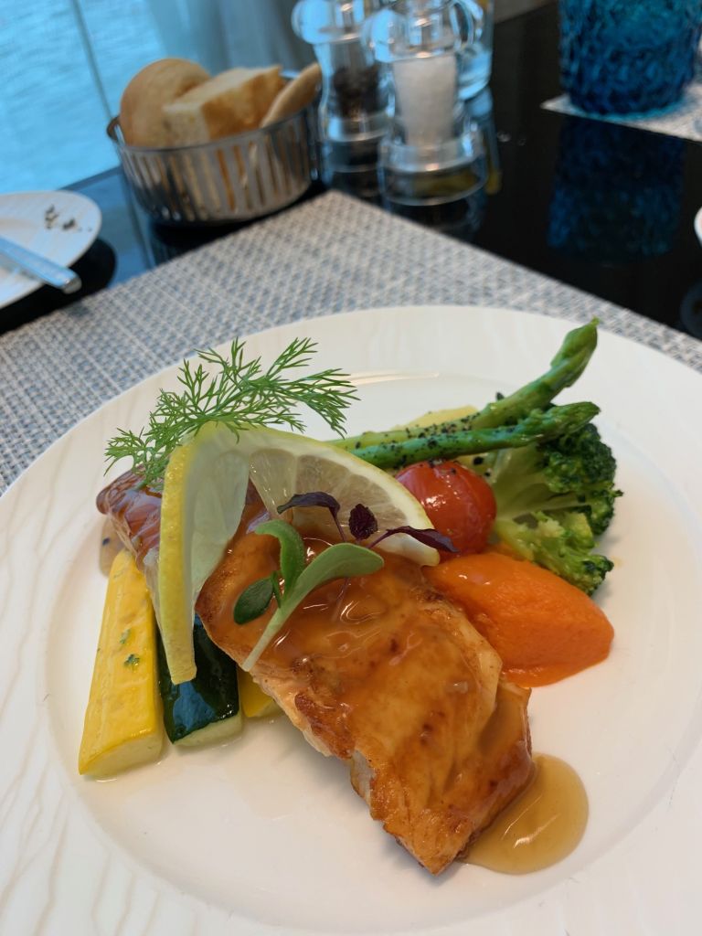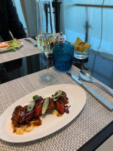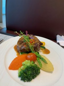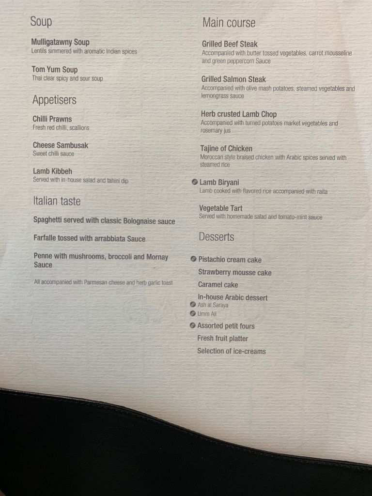 Zunächst wurde ein kleines Amouse Bouche gereicht. Die Tom Yum Suppe war leider quasi nur eine Brühe, schmeckte dafür aber erstaunlich gut. Während die Cheese Sambusak eher gutes Convenience-Food waren, war der Lamm-Spieß aber sehr delikat. Im Vergleich der Hauptspeisen konnte das Lachs-Steak punkten. Das Beef-Steak war leider eine Schuhsohle und interessanterweise in der Mitte aufgeschnitten. Wir reklamierten dies und uns wurde erläutert, dass die kompletten Gerichte zubereitet angeliefert werden. Also quasi wie an Board. Das Personal ließ es sich jedoch nicht nehmen, einen weiteren Versuch zu starten und forderte dafür extra den Chefkoch an, der zu dem Zeitpunkt nicht vor Ort in der Küche war. Und ja, der zweite Versuch war deutlich besser.