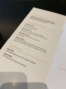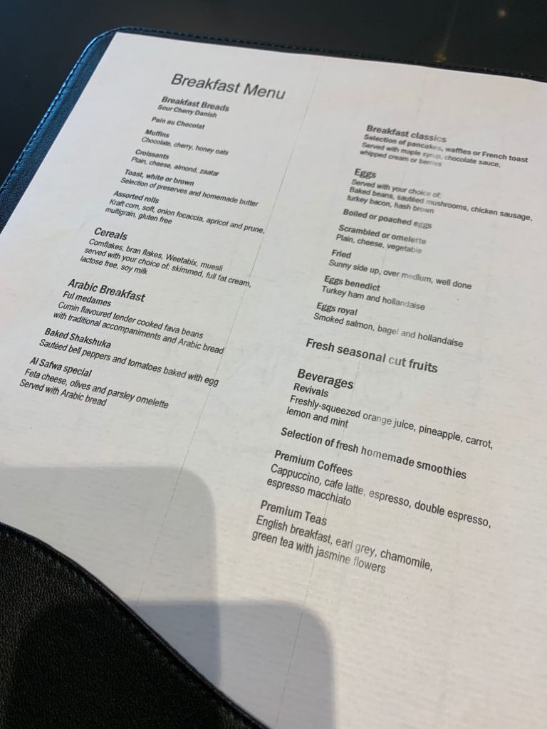 Das Haupt-Restaurant serviert morgens Frühstücks-Speisen a la Carte. Zur Auswahl steht neben klassischen westlichen Frühstücks-Optionen, wie Croissants und Toast, natürlich auch eine Selektion an arabischen Frühstück und diverse frisch zubereitete Eierspeisen. Dazu gibt es gleich mehrere Seiten an Kaffee- und Teespezialitäten. Unter anderem eine separate Ga Wa Chai Kaffee- und Tee-Karte. Ich entschied mich zu diesem Zeitpunkt für einen caramel flavored Ice Tea und Eggs Royale. Was auch immer meine Frau hatte, hat es aus irgendwelchen Gründen nicht auf das Bild geschafft.