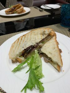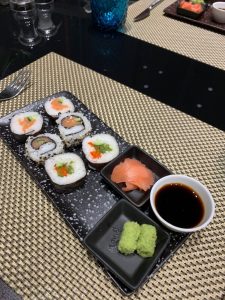 Statt einem Afternoon-Tea nahmen wir in dem kleineren Restaurant zwischenzeitlich einen Snack zu uns. Dort gab es ein Steak-Sandwich, so wie es auch in Al Mourjan serviert wird, und eine Auswahl an Sushis. Beides war geschmacklich sehr gut, nur der verwendete Reis war leider kein echter Sushi-Reis.