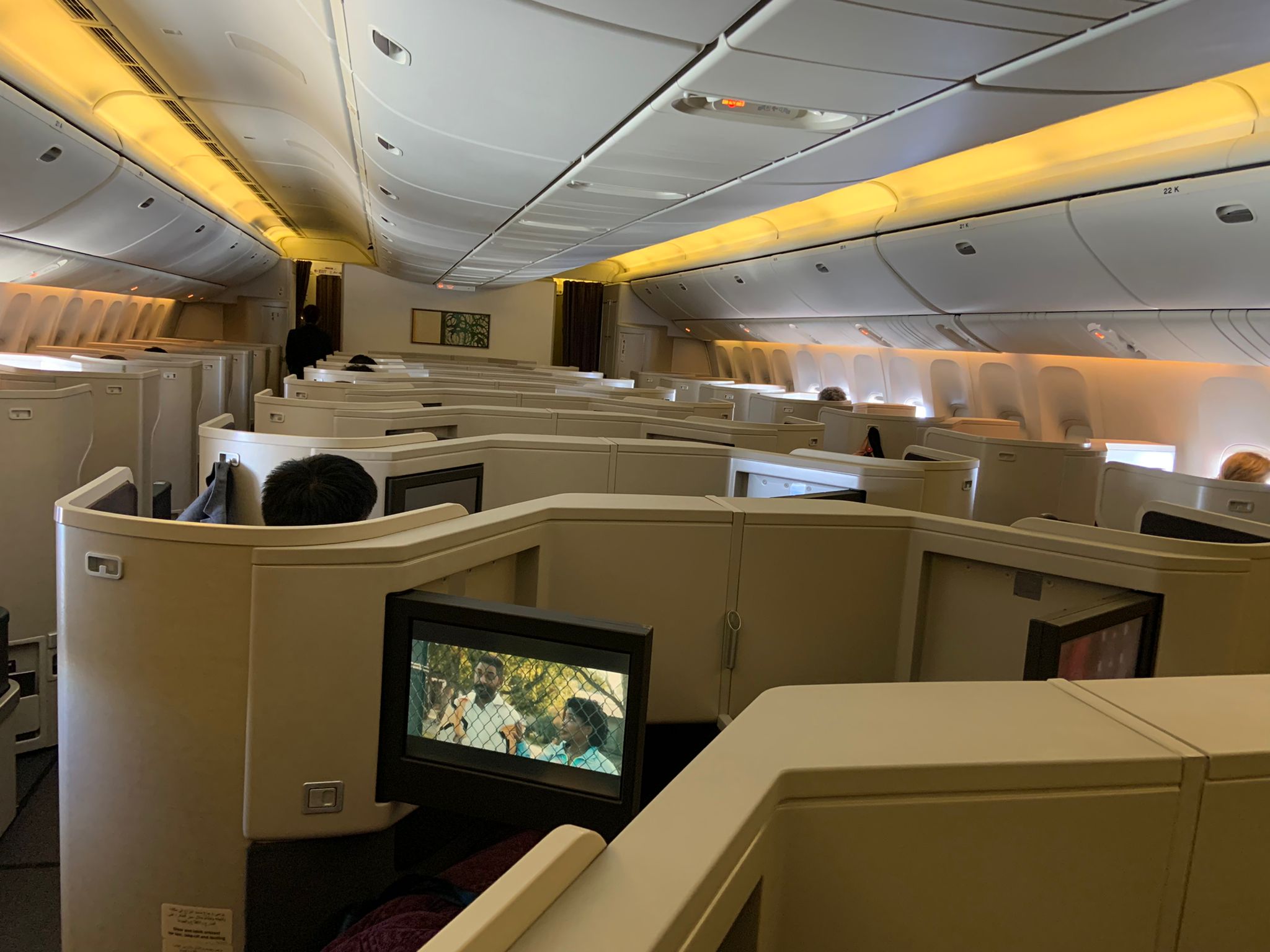 Zum Einsatz kam heute eine Boeing 787-8. Qatar hat schon 30 der kleineren Dreamliner in der Flotte, derzeit werden auch die größeren B787-9 eingeflottet, wovon ebenfalls 30 Einheiten für die Katarer bestimmt sind. In der 787-8 hat QR lediglich 22 Business Class Sitze einbauen lassen, 20 davon sind auf fünf Reihen zwischen den vorderen beiden Türpaaren installiert.