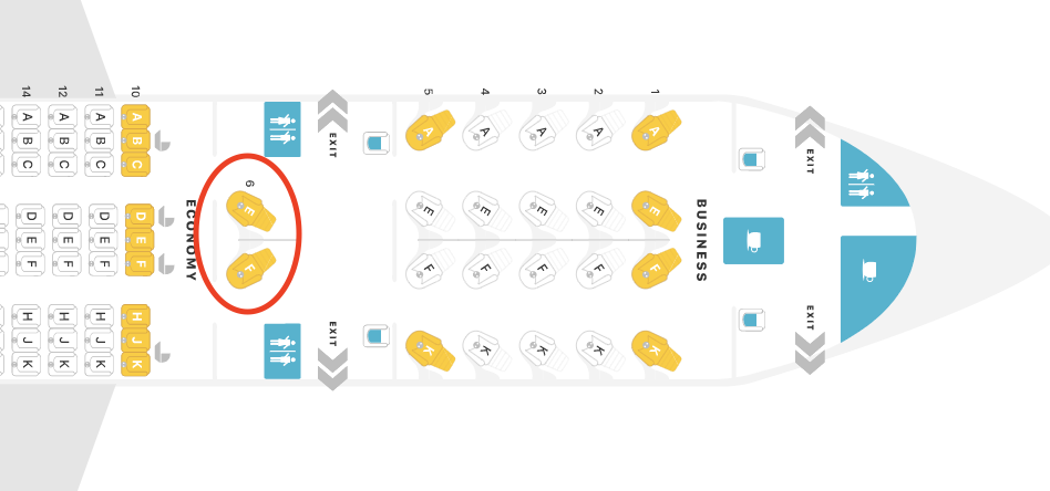 Zwischen der Reihe 5 und 6 ist ein Türpaar, der Freiraum und die Fläche kommen hier während des Fluges sehr gut zur Geltung. Hier kann man sich auf längeren Reisen etwas aufhalten und die Beine vertreten. Das Geschehen würde man also von den beiden „speziellen“ Sitzen auch direkt mitbekommen, was für ein weiteres Minus sorgt.