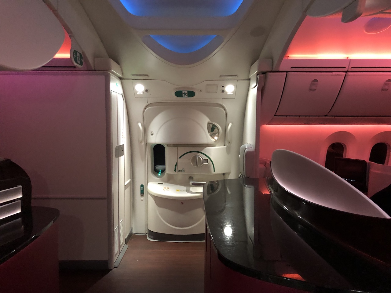 Die verbleibenden zwei Plätze (6E & 6F) liegen dahinter und sind mittig zwischen zwei Toiletten angeordnet. Hier ist man bereits beim Boarding auf dem Präsentierteller, da alle Gäste der Economy Class an diesem Sitzpaar vorbei müssen. Unsere Sorge war, dass während des Fluges die Toiletten zum Problem werden könnten. Dies hat sich aber zum Glück nicht bewahrheitet. Die Eingangstüren für die Waschräume sind von den Sitzen weggerichtet, die Vorhänge zur Economy waren zudem mit Druckknöpfen verschlossen.