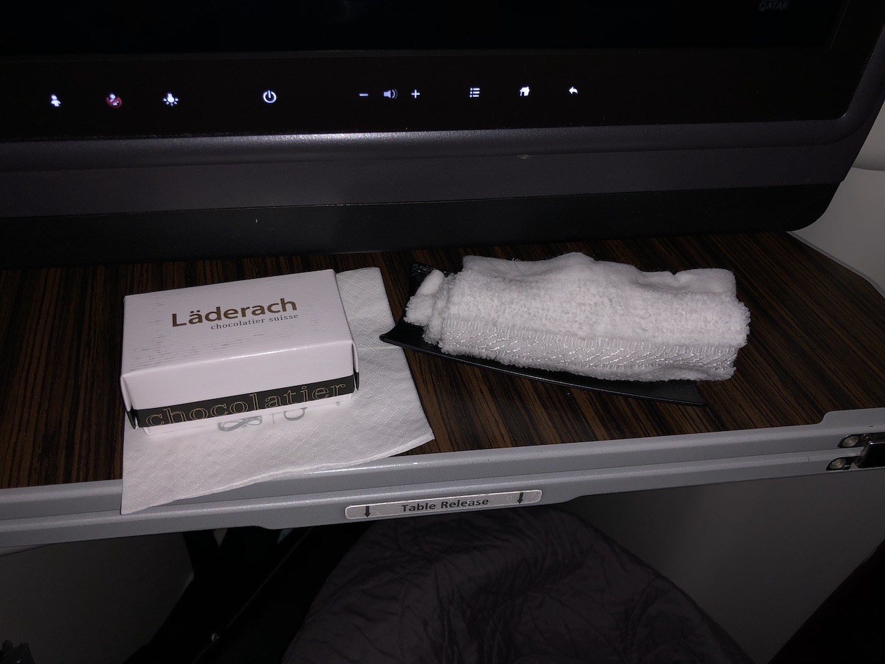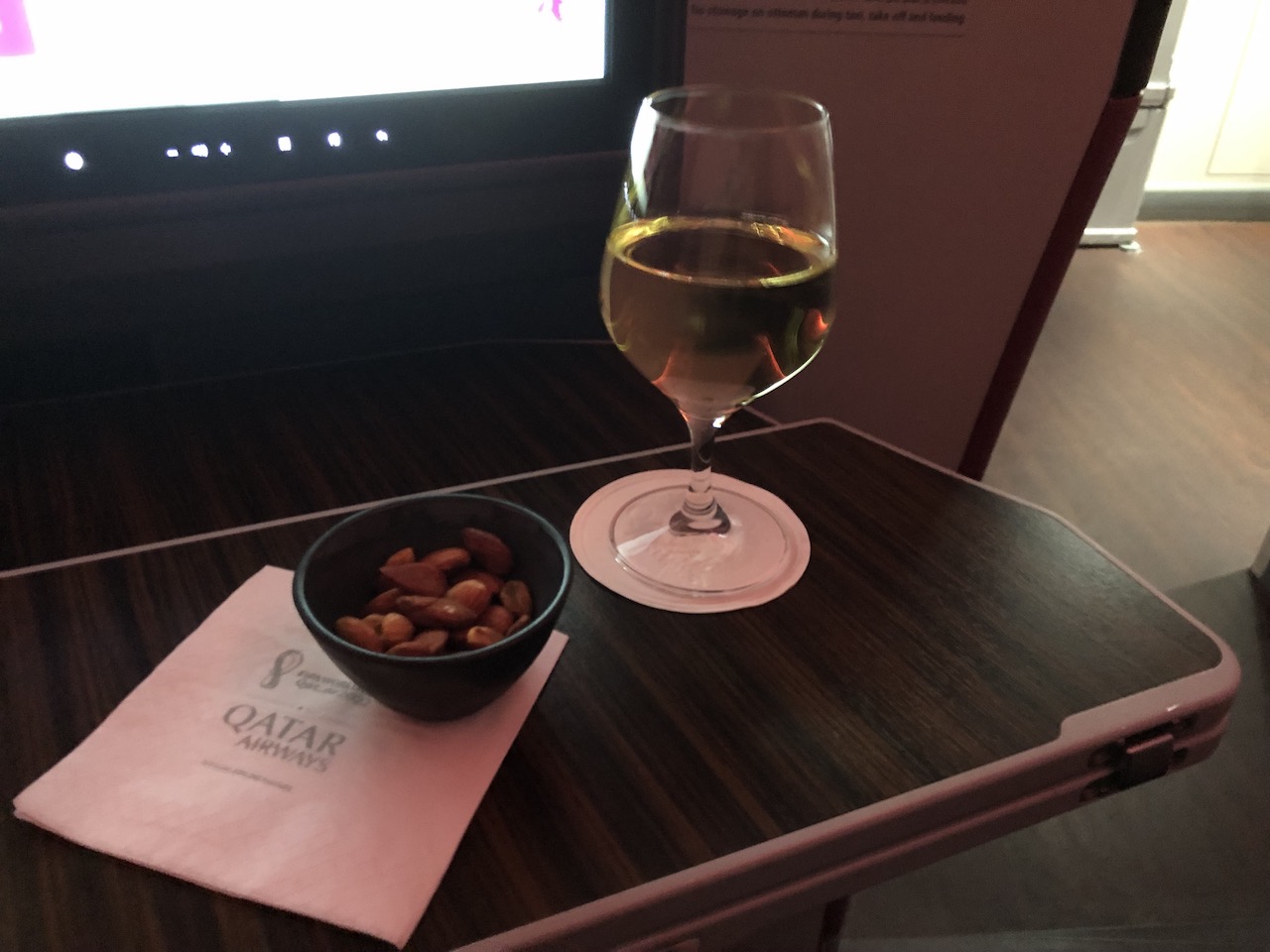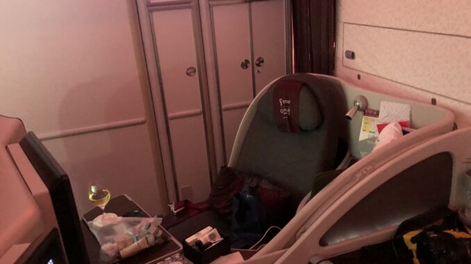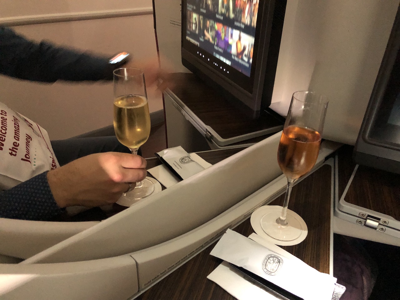 Eine Kontinuität gibt es bei Qatar also zumindest nicht bei den Sitzen, aber durchaus beim Service. Fast immer stellen sich der oder die zuständigen Flugbegleiter noch am Boden vor, bringen Amenity Kits, Erfrischungstücher und ein Willkommensgetränk. Während des Boardings ist dies für die Reihe 6 etwas schwierig, da beide Gänge verstopft sind. Dennoch hat es zum Push back noch ein Champagner zu uns geschafft.
