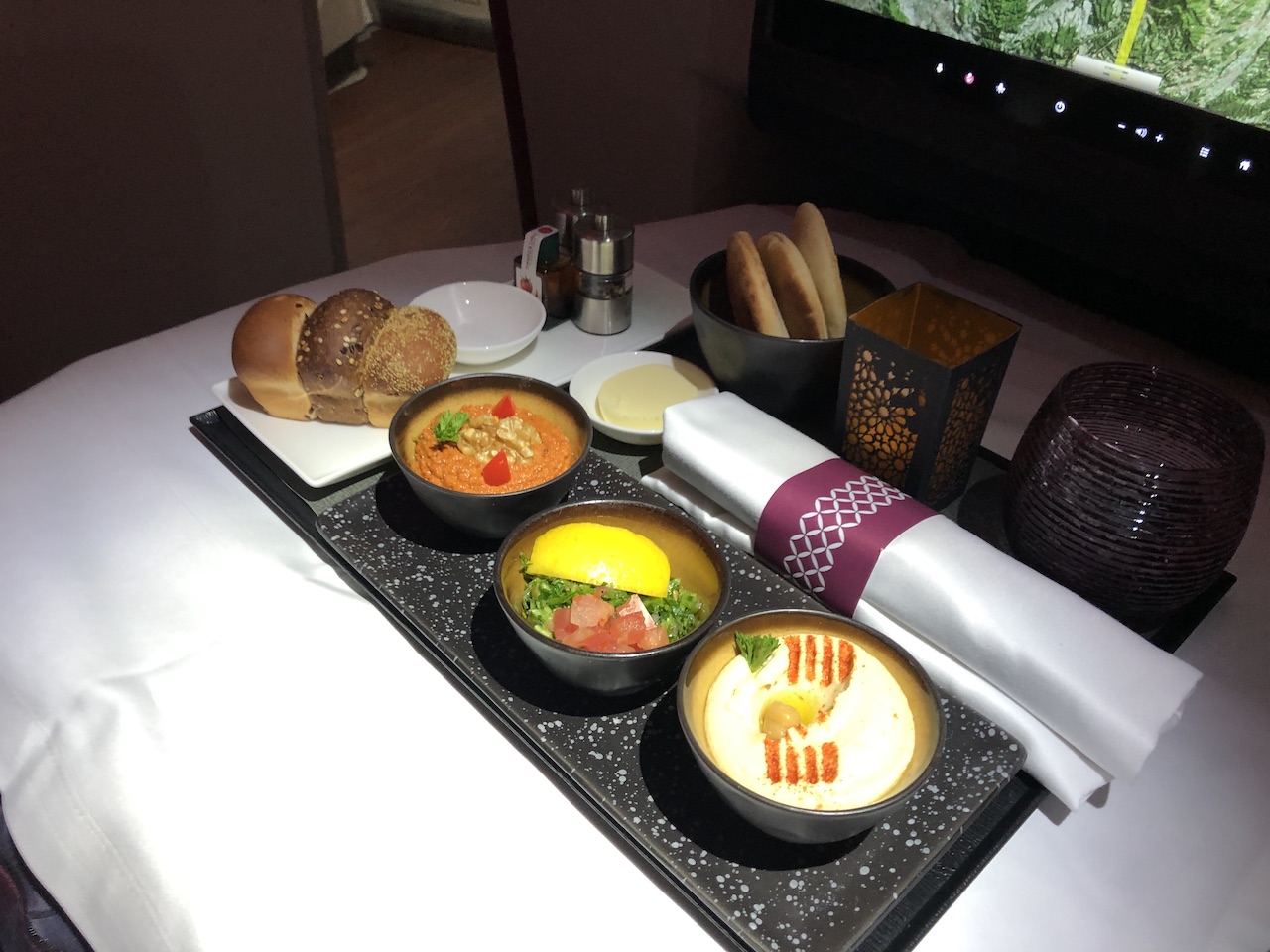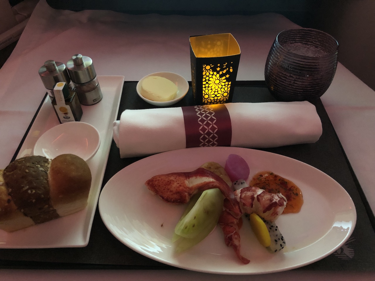Während des Fluges war es dann für die Flugbegleiter kein Problem mehr zu uns durchzukommen, dennoch sind diese Sitze am weitesten von der Galley entfernt. Bei Qatar wird der Service in der Business Class nie vom Trolley durchgeführt, alle Bestandteile müssen also durch die Kabine getragen werden. Hier hat man uns dann während des Service ab und an einfach vergessen.