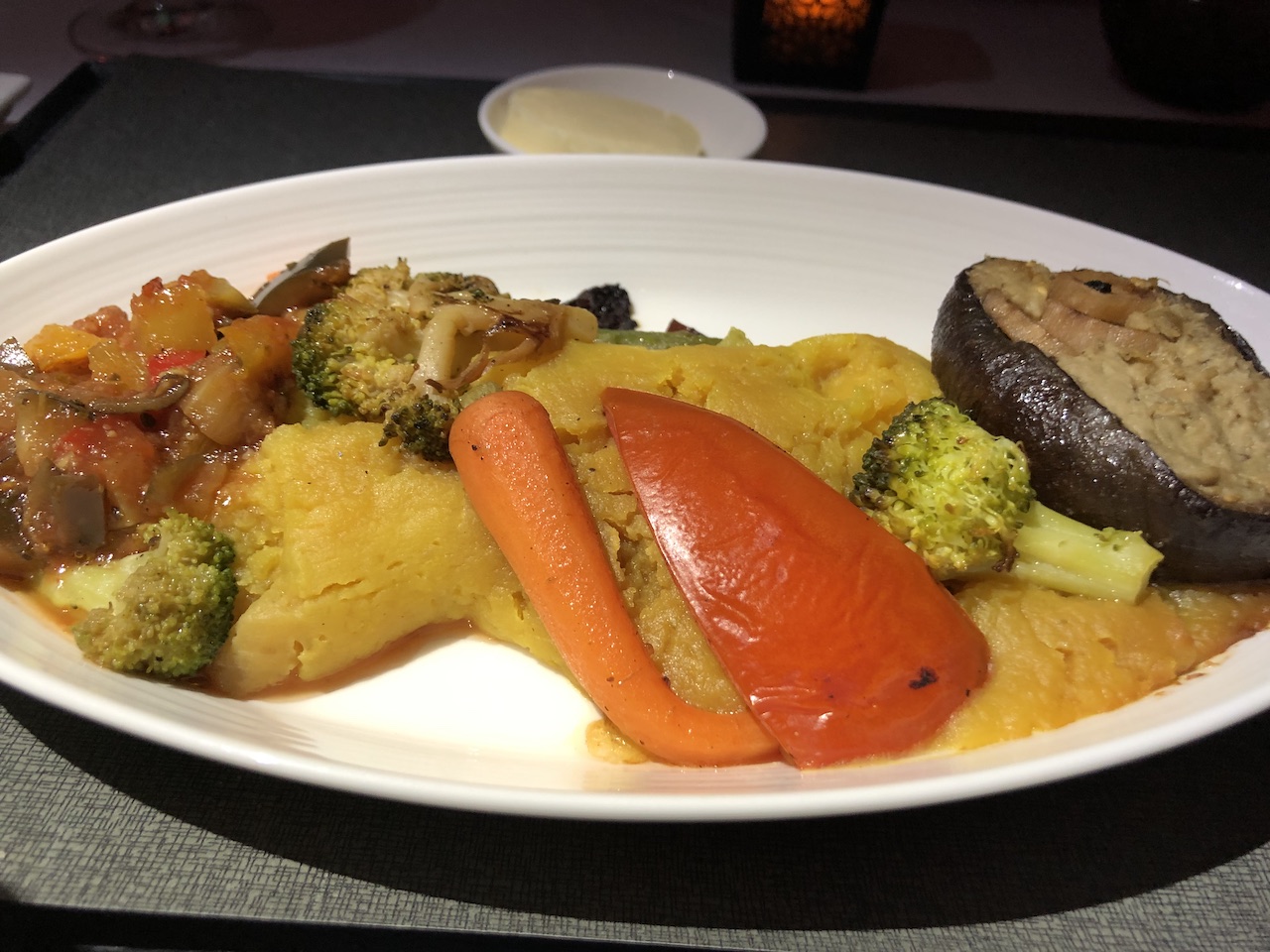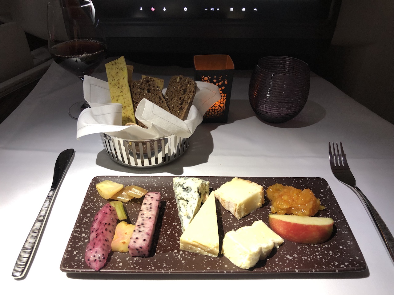 Aperitif, Vorspeisen, Hauptgänge, Dessert, Weinauswahl und Präsentation waren wieder sehr gut. Nur der abschließende Kaffee hat es nicht mehr zu uns geschafft, die Flugbegleiter begründeten dies mit den permanent angeschalteten Anschnallzeichen. Nach einer Stunde Fernsehen und einer Stunde Schlaf wurde eine ganze Stunde vor der Landung die Beleuchtung eingeschaltet und das Gewusel war perfekt.
