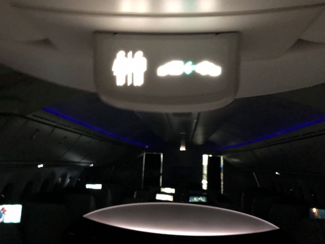 Im Gegensatz zur restlichen Kabine wirken die beiden Sitze der sechsten Reihe also ziemlich gequetscht, die seitlichen Schränke zerstören zudem etwas das Ambiente, es fehlen Fenster. Im direkten Vergleich könnte man denken dass die restlichen Sitze in einem ganz anderen Flugzeug sind.
