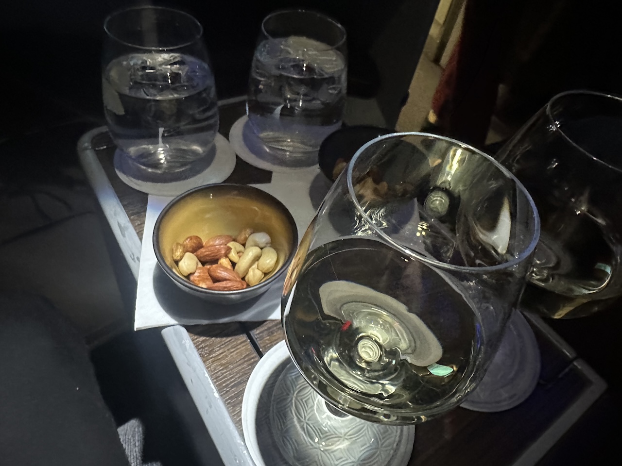 Heute ist es genau so abgelaufen, vielleicht auch weil die Business Class nur gut voll gebucht war. Nach dem Start ging es zügig los, der Aperitif wurde mit Nüssen serviert, dann hat man die Tische eingedeckt und die Menüfolge aufgetischt. Die für uns zuständige Flugbegleiterin war auch zu Smalltalk aufgelegt, sie erzählte uns dass sie zum ersten Mal in Chingqing war und das Layover vier Tage dauerte. Wir erreichten Doha pünktlich.