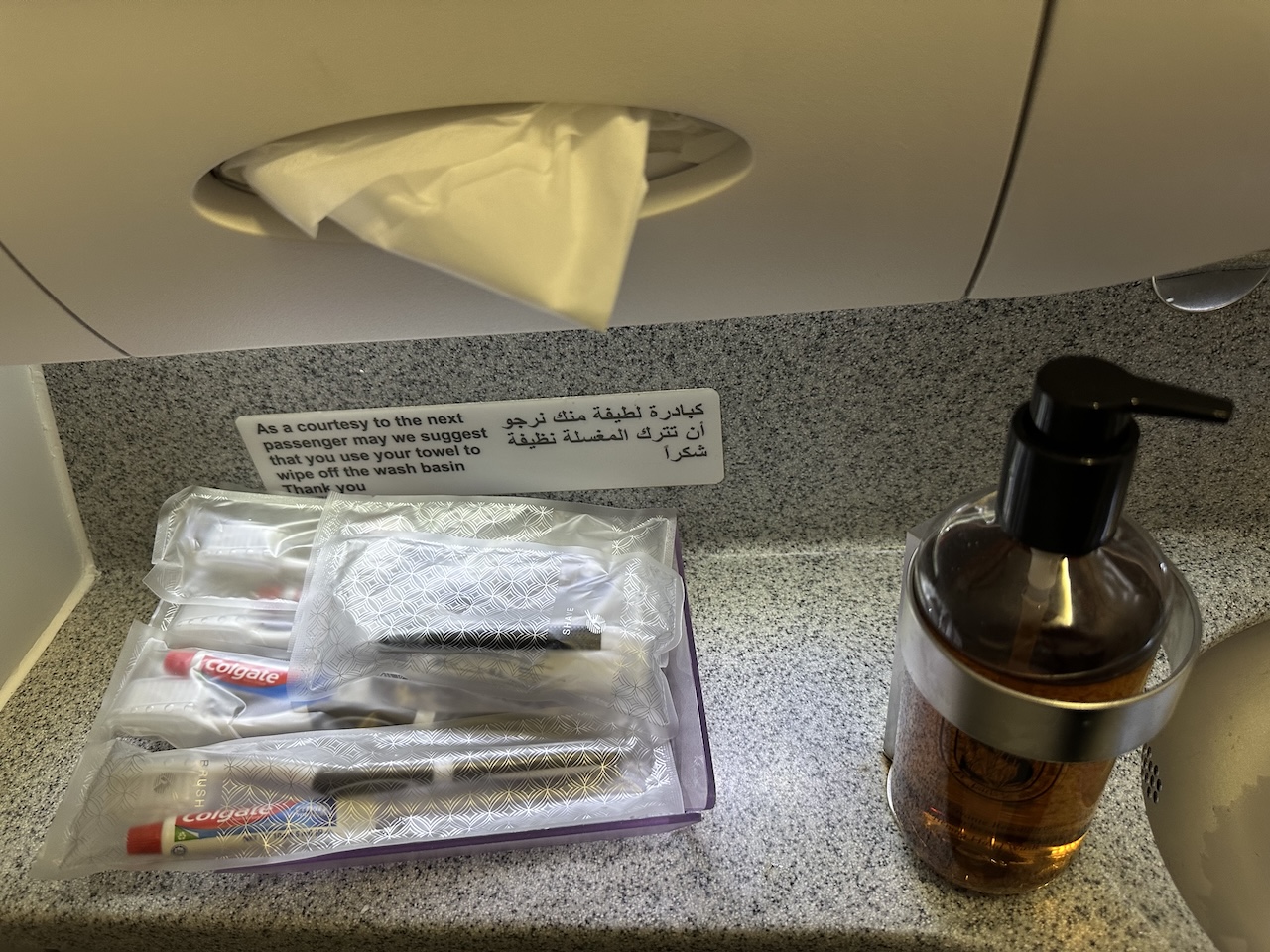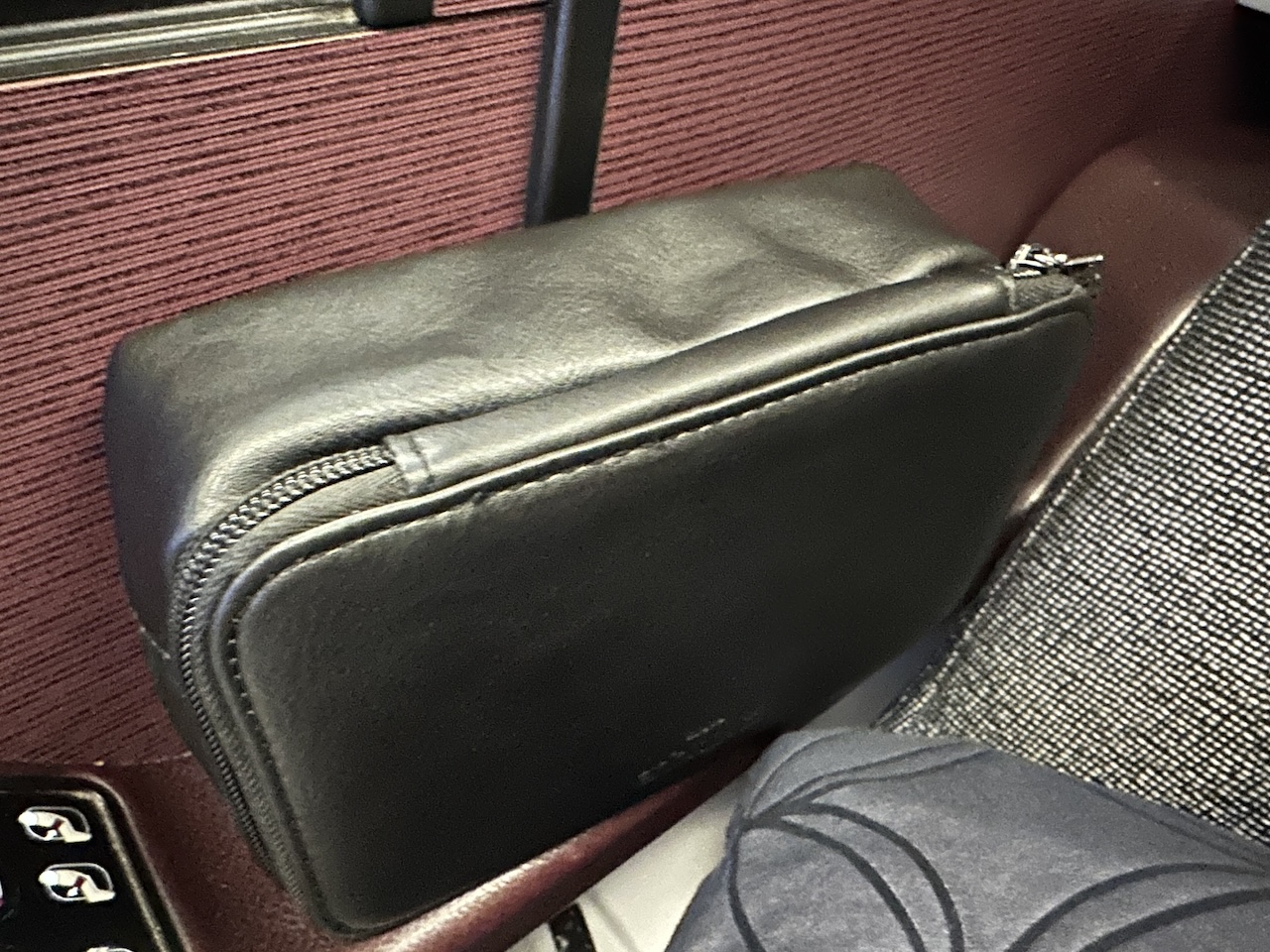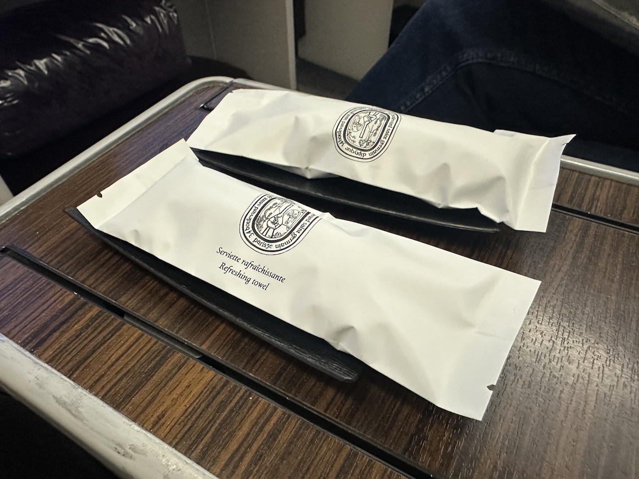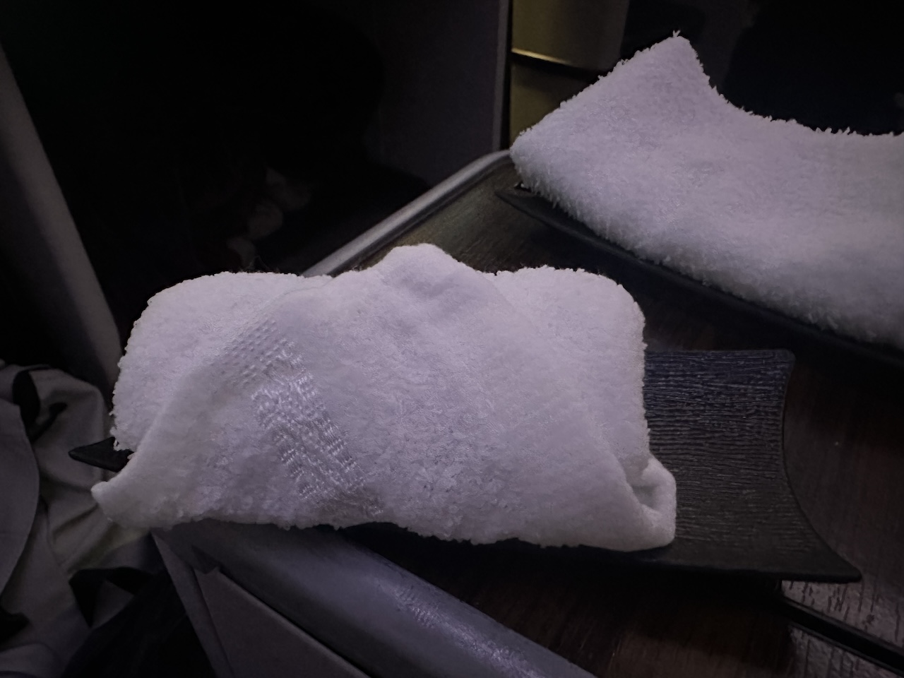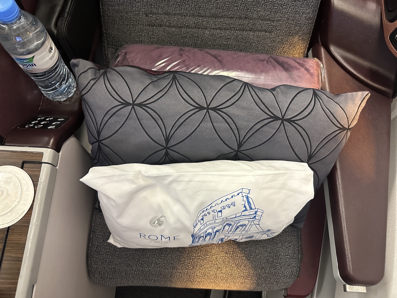 Neben den beiden Kissen und der Decke lagen auch schon Kopfhörer, Wasserflasche, Speisekarten und Erfrischungstücher am Sitzplatz.