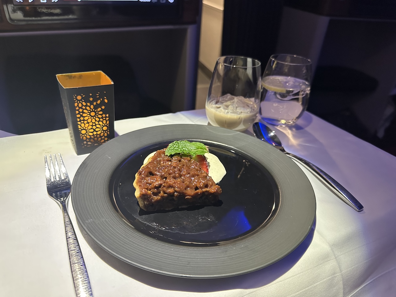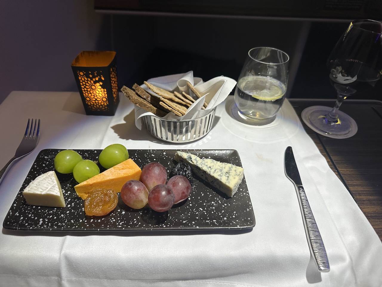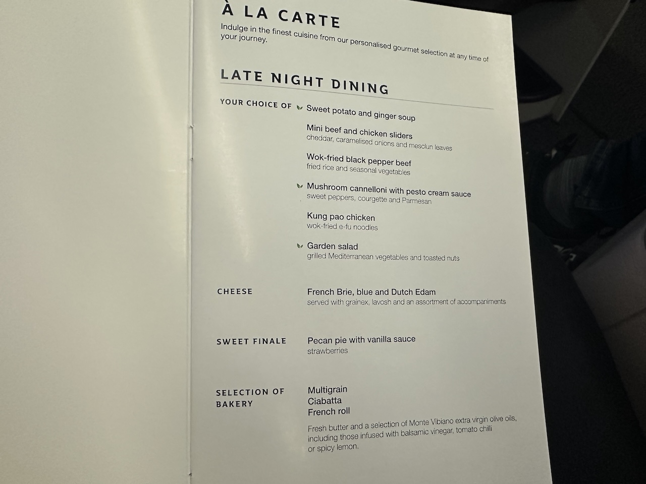 Catering ist für Qatar Airways ein wichtiges Thema. Trotz der späten Stunde wurde ein Late Night Dining mit sechs verschiedenen Optionen plus Käse und Dessert angeboten.