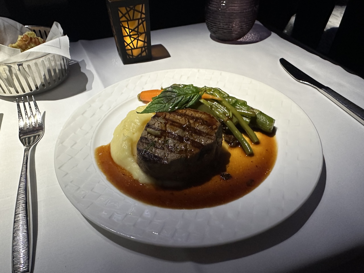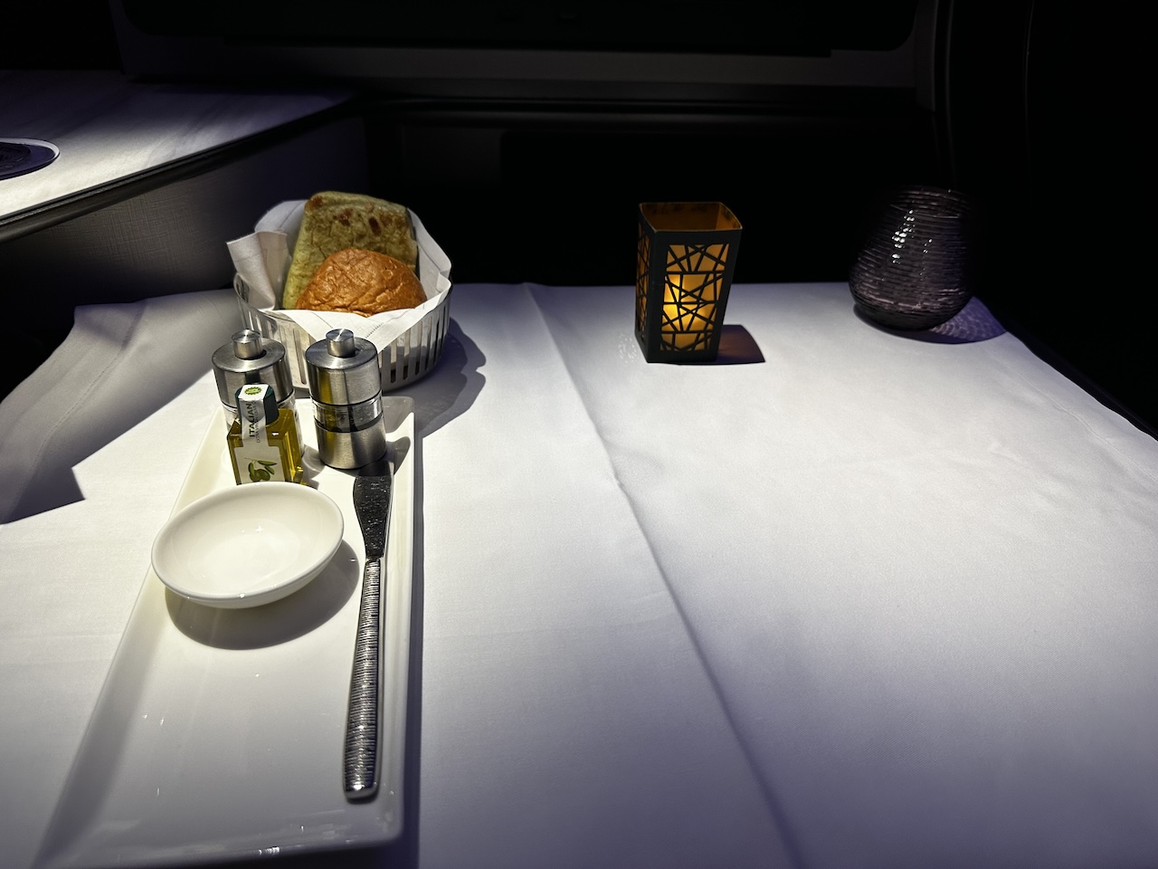 Pünktlich ging es in den Nachthimmel, der Flug sollte gut 6 Stunden dauern. Die Crew war noch im Steigflug damit beschäftigt einige Betten herzurichten, die Schiebetüren der einzelnen Suiten zu entriegeln und die ersten Tische einzudecken. Leider passierte bei mir lange Zeit nachdem die Tischdecke kam nichts mehr. Ich überlegte auch den Service ausfallen zu lassen, habe aber dann noch etwas gegessen und es nicht bereut.
