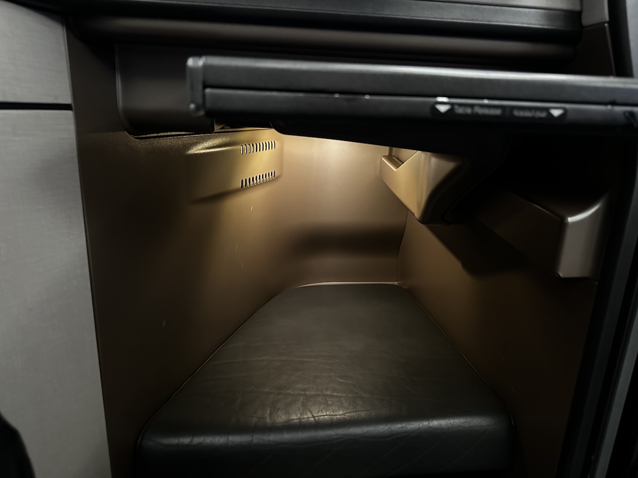 3. Den Platz unter der „Fußablage“ (Verlängerung des Bettes für die Füße) nutze ich im Sitzen manchmal, um meine Beine lang auszustrecken. Das ist in der Q-Suite nicht möglich, da unter besagter „Fußablage“ irgend etwas verbaut ist und der Platz eben durch Technik, Lüftung o.ä. genutzt wird.