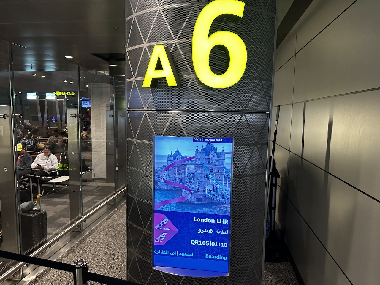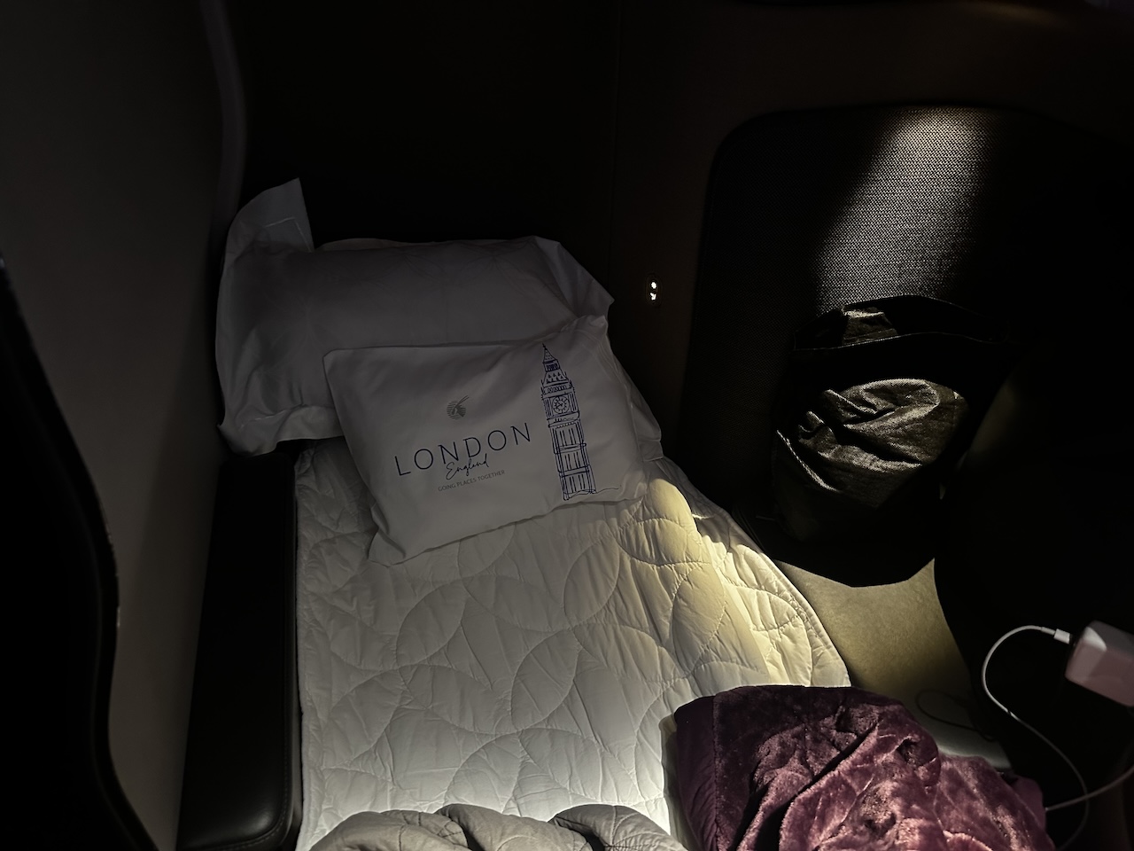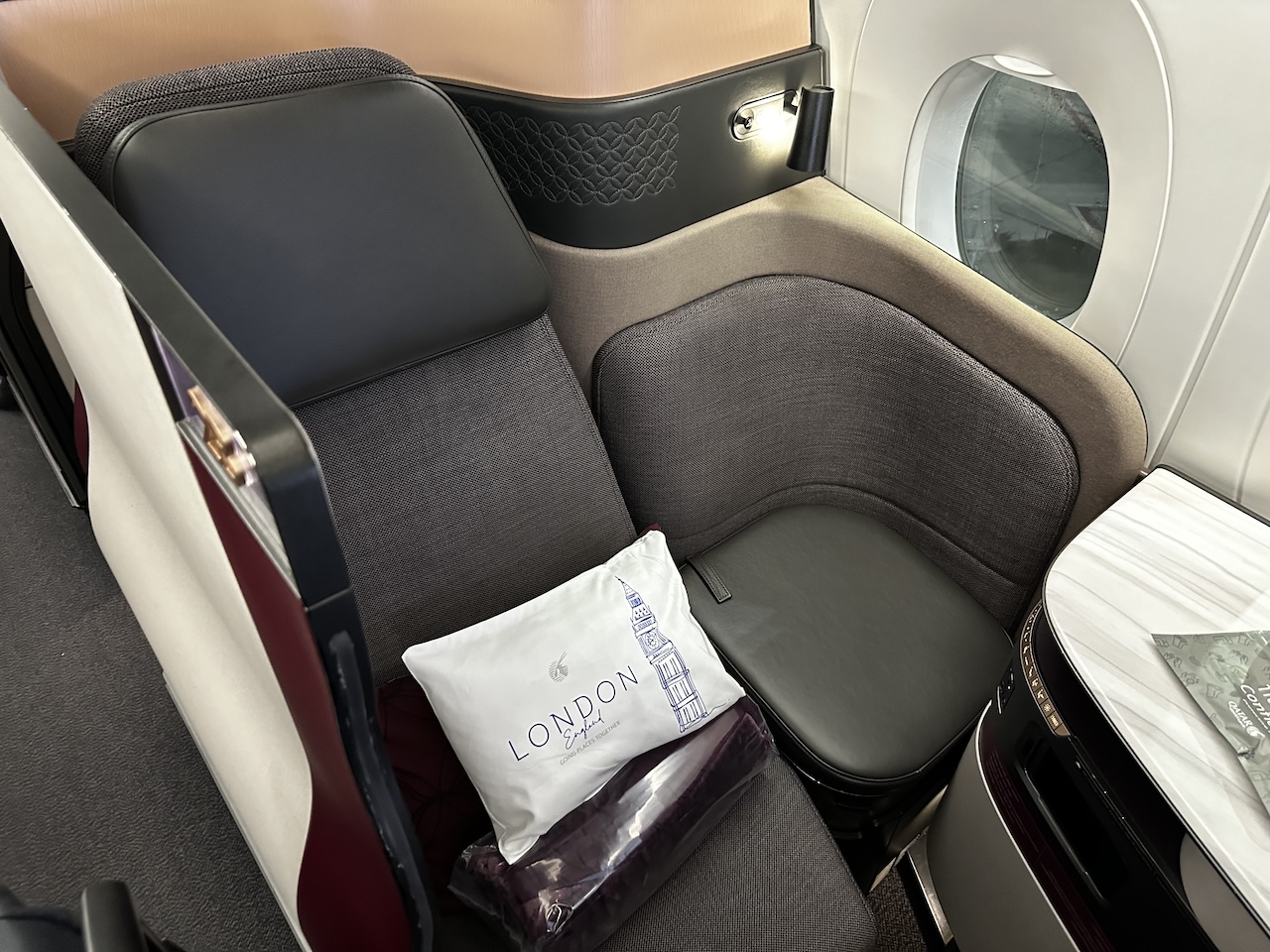 Qatar hat mich dann auf meinen Wunsch hin auf eine Umsteigeverbindung via London umgebucht. Ich hatte die Auswahl zwischen den Reverse-Heringbone Sitzen im Airbus A380 und den Q-Suites im A350-1000, beide Flüge verließen Doha zur selben Zeit. Start war um 1 Uhr nachts, ich habe mir von den Q-Suites etwas Ruhe versprochen und diese Verbindung gewählt.