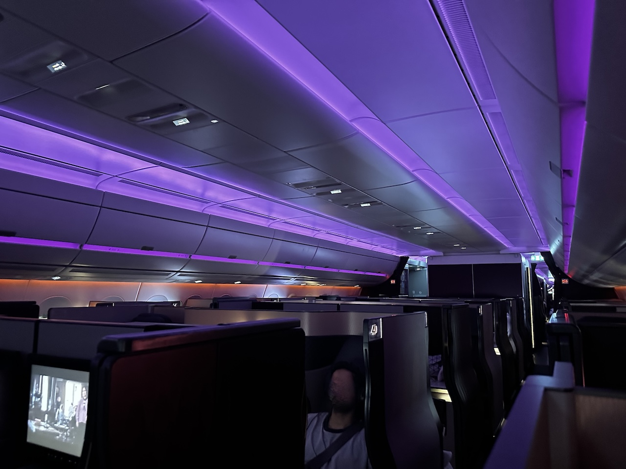 Der Airbus A350-1000 ist groß, entsprechend gibt es auch in der Business Class viele Plätze. Der Flug war fast ausgebucht, viele Passagiere machten sich schon bettfertig für eine kurze Nacht über den Wolken.