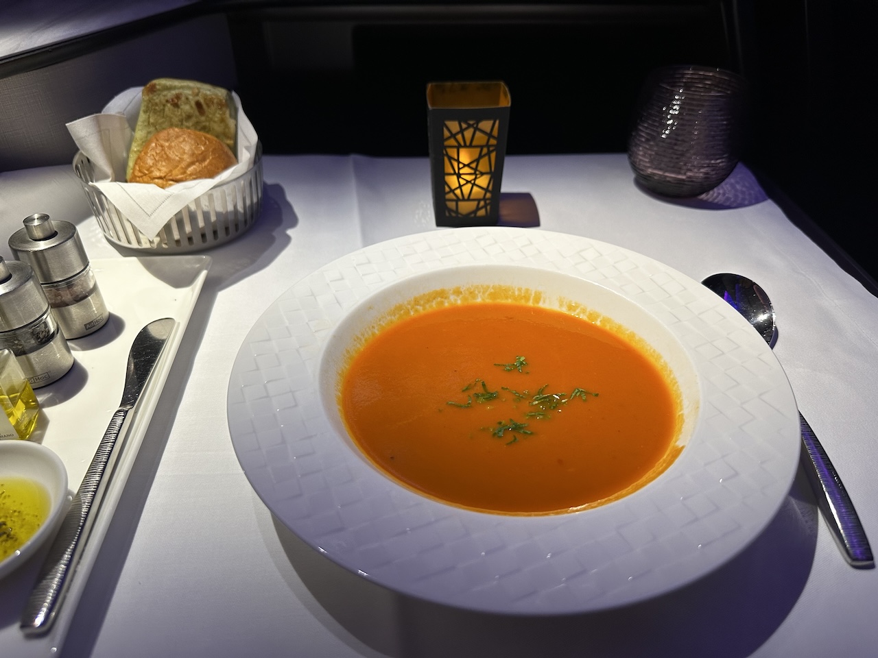 Ich wollte eigentlich auf Brot und Vorspeise verzichten und gleich die Suppe essen, hier fehlte es aber an Flexibilität. Nicht schlimm, irgendwann ging es dann ganz zügig, wobei der Service für einen relativ kurzen Flug durch die Nacht zu umfangreich ist. So wird z.B. für einen Wein immer erst ein Glas gebracht, die Flasche kommt dann etwas später. Keine Frage- eine tolle Geste, die aber zu viel Zeit kostet und bei einem Tagflug eher zelebriert werden kann.