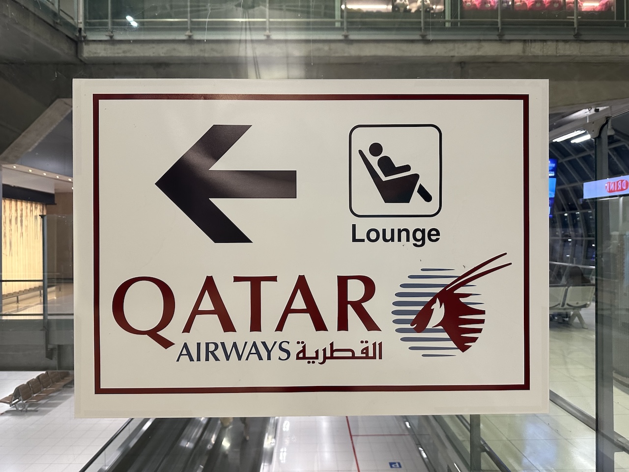 Wie die anderen Lounges ist auch die von Qatar Airways ganz gut ausgeschildert. Mann muss nur nach der Pass- und Sicherheitskontrolle genau aufpassen wo man abbiegt. Unterm Strich braucht man nur etwa 5-10 Minuten bis ein Schild bei den D-Gates auf die nach unten gehende Rolltreppe hinweist, wo dann der etwas unscheinbare Eingang zu sehen ist.