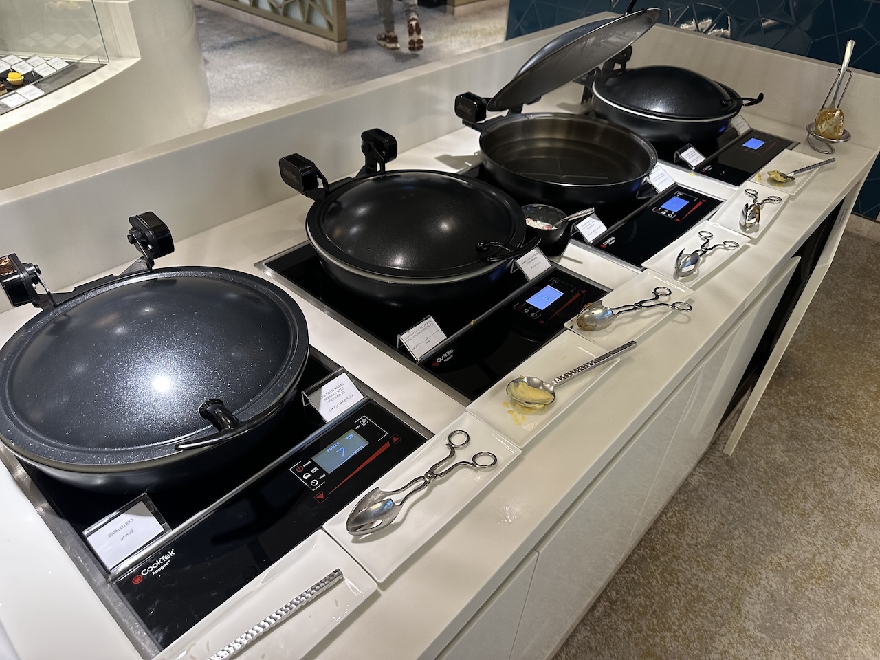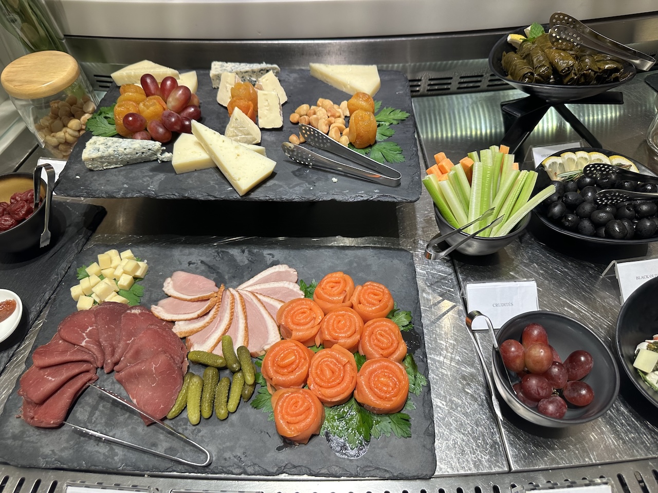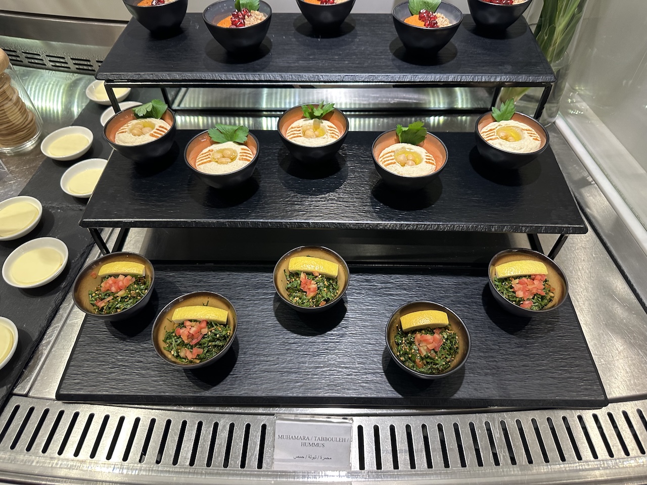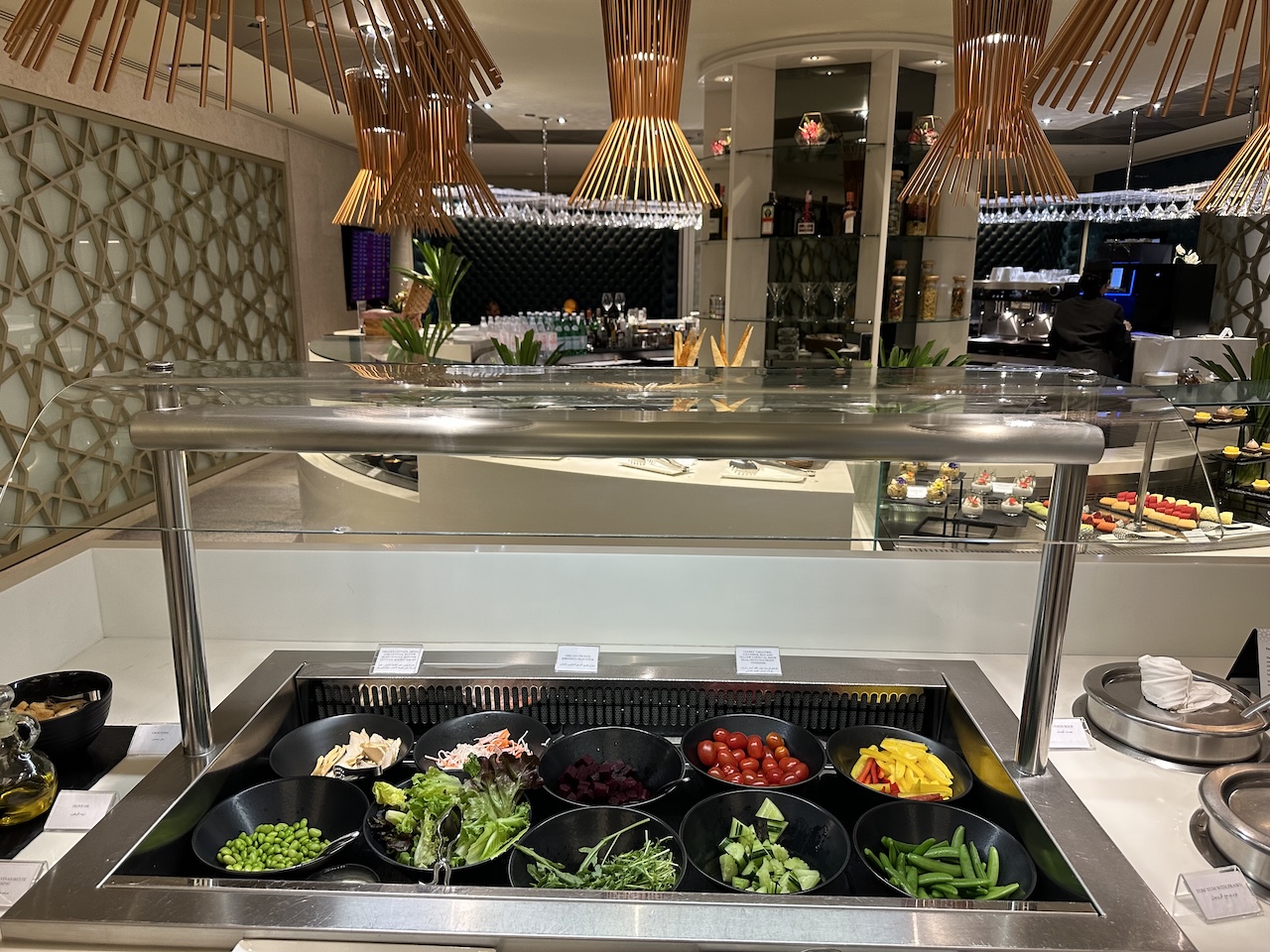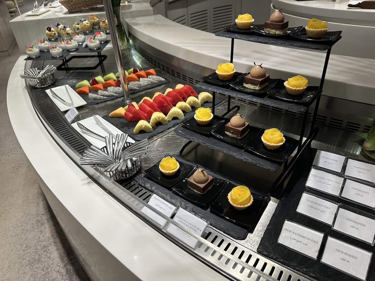 Getränke und Hauptgänge werden an den Platz serviert, einen Service, den man sonst nur von den First Class Lounges kennt. Zwischendurch konnte man sich arabische Mezze, zusätzliche warme Optionen wie Lachs oder Hühnchen oder Käse und Dessert als Finale holen.