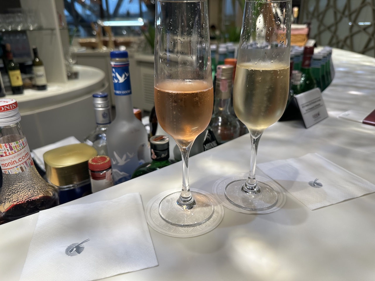 Ähnlich wie an den Lounges am Heimatflughafen in Doha lässt sich der Carrier auch an den Außenstationen nicht lumpen. Getränke stehen nicht nur an der Bar und im Restaurant zur Verfügung, ein Basic-Sortiment ist auch im Sitzbereich verfügbar.