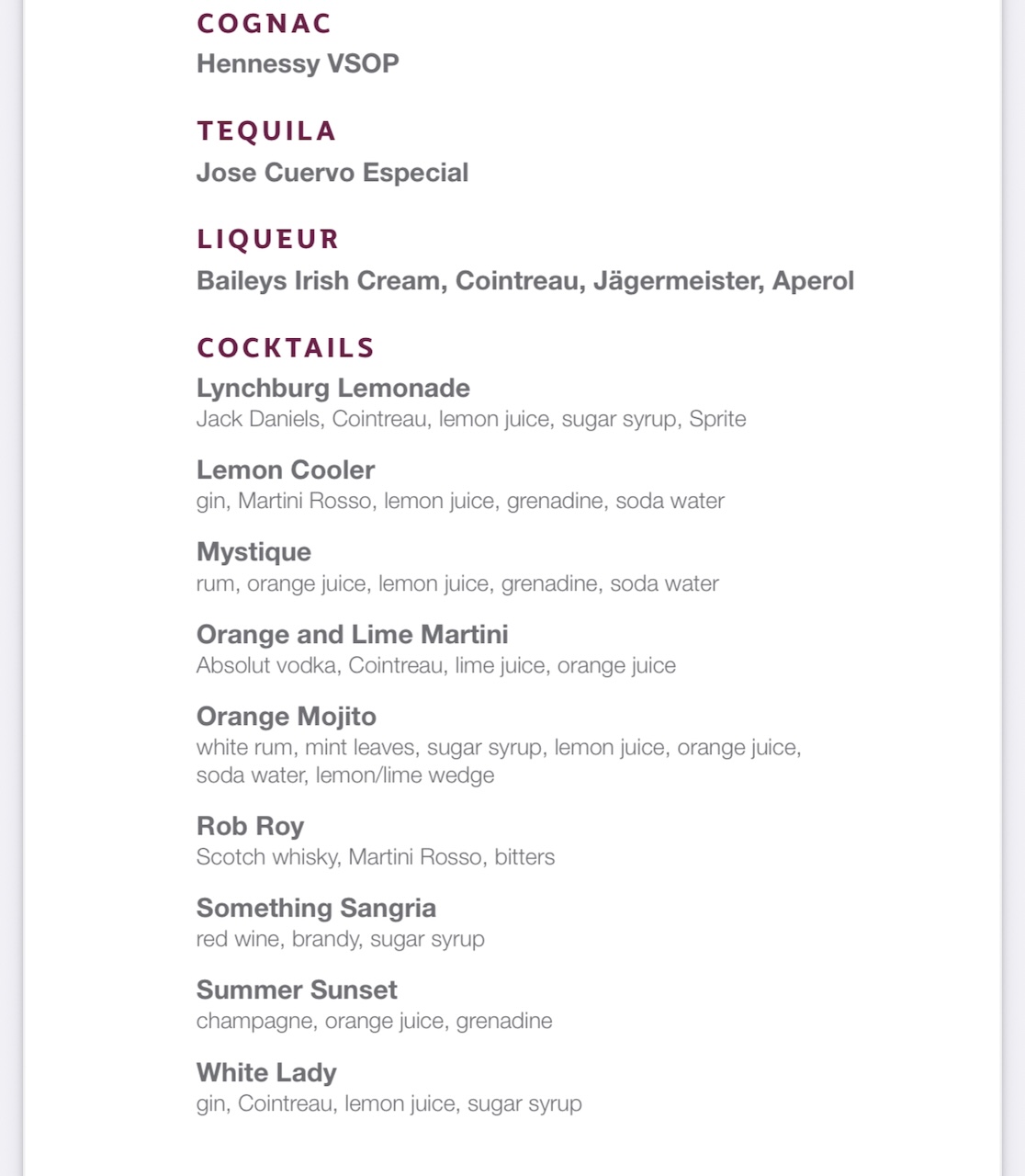 Die Auswahl ist groß, dadurch können entsprechend auch diverse Longdrinks und Cocktails zubereitet werden. Eine Auswahl ist in der Menükarte vorhanden.