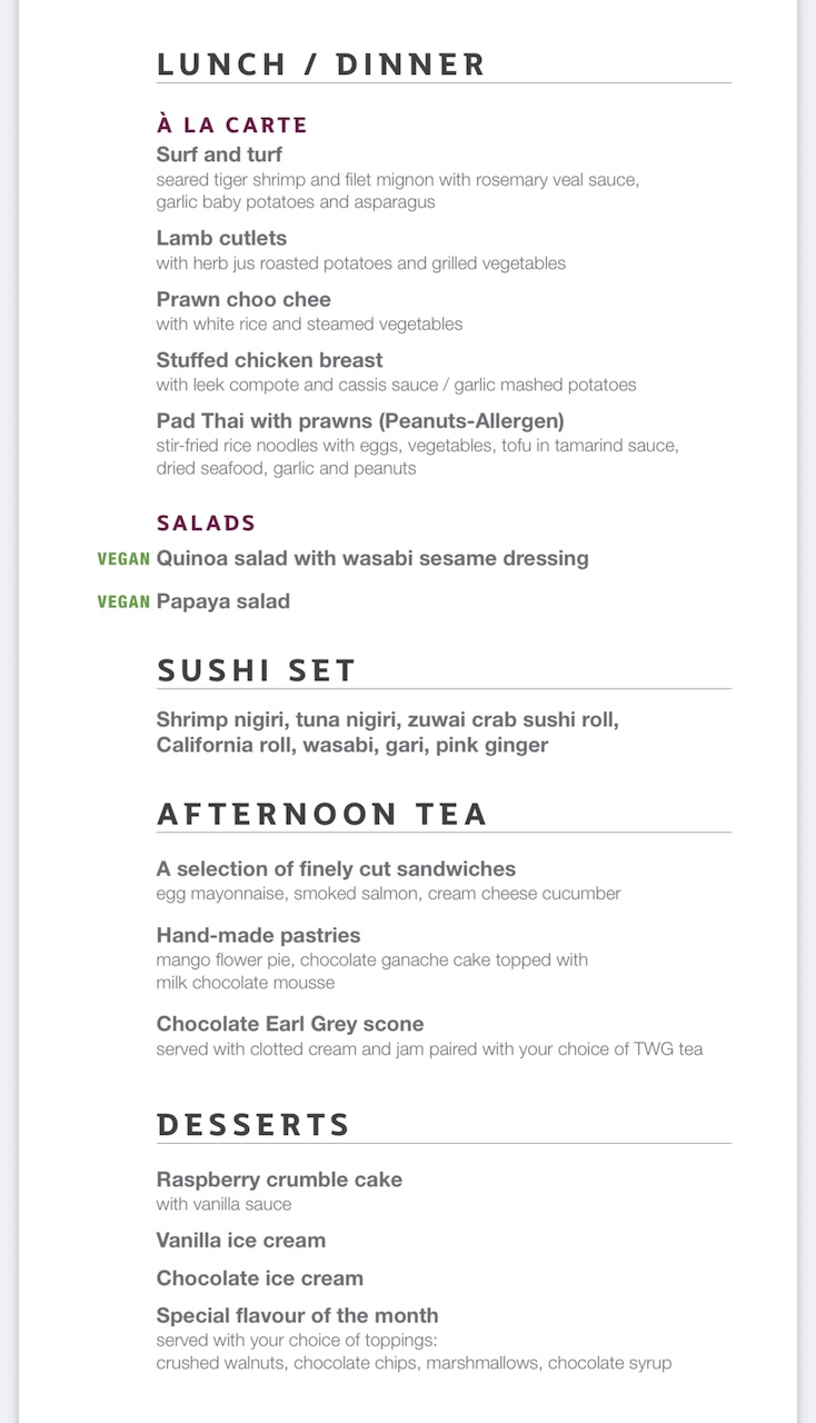 Dort sind auch die Mahlzeiten aufgelistet. Neben einigen Hauptgerichten, die individuell zubereitet werden, gibt es auch Salate, Suppen, Vorspeisen, Brot und diverse Snacks sowie Dessert.