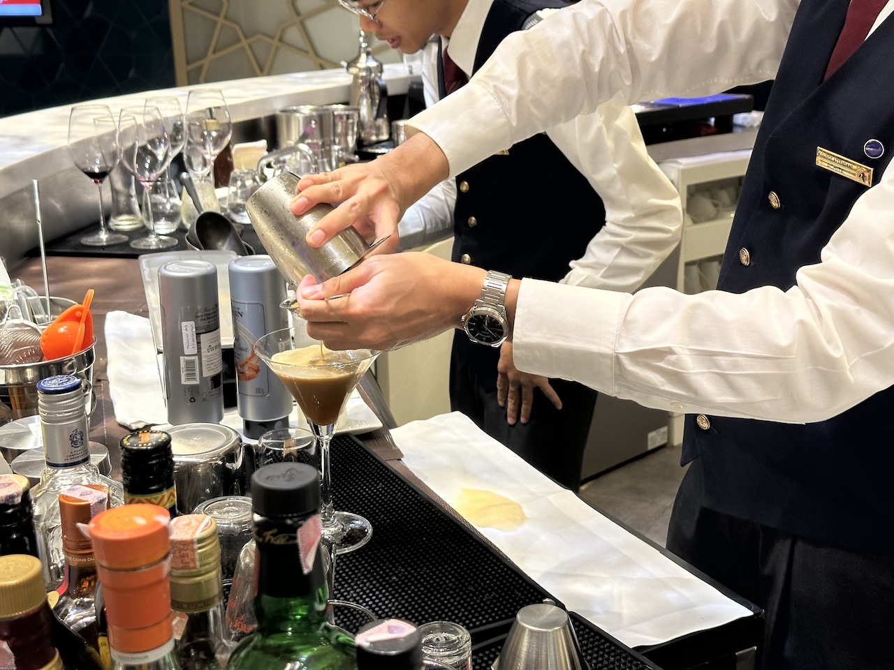 Zum Abschluss sind wir noch einmal an die Bar, dort wurden schon fleißig Cocktails gemixt bzw. Cappuccino im Qatar-Style gefertigt.