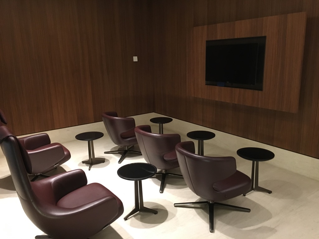 Die Qatar Airways Premium Arrivals Lounge ist eigentlich eine überraschend kleine Lounge, allerdings bietet sie alles, was man von einer Arrivals Lounge erwarten kann. So befinden sich direkt nach dem Fahrstuhl, mit welchem man hoch zur Lounge fährt einige Sitzgruppen aus Sesseln, sowie ein kleines Fernsehzimmer.