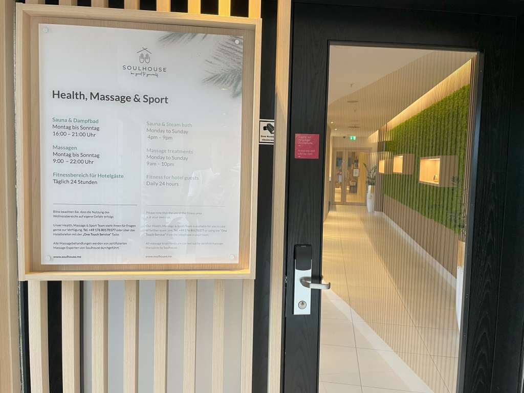Alles, was Ihr zum körperlichen Wohlbefinden unternehmen könnt, findet Ihr auf der zweiten Etage des Hotels. In einem voll ausgestatteten Spa – dem Botanical Spa Soulhouse – werden täglich von 9 bis 21 Uhr Massagen und Anwendungen angeboten. Während dieses Angebot kostenpflichtig ist, können Hotelgäste montags bis freitags zwischen 16 und 21 Uhr Sauna und Dampfbad nutzen. Das sind die Angaben von der Webseite. Am Eingang befindet sich ein Hinweis, dass die Einrichtung montags bis sonntags zu den genannten Zeiten geöffnet ist. Als Ruhebereich dient auch eine Panoramaterrasse.