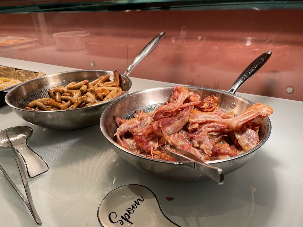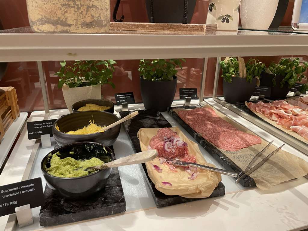 So wie sich die Gäste verhielten, sah teilweise auch das Büfett aus. Immer wieder mischten sich leere oder stark geplünderte Körbe und Teller sowie hinuntergefallenes Obst in das Gesamtbild eines sonst sehr ordentlich ausgestatteten Frühstücksangebotes. Von Brot und Brötchen über süße Backwaren bis hin zu Cerealien gab es ein ordentliches Angebot an Kohlenhydraten. Mit warmen Optionen wie Rührei, Speck und Würstchen wurde auch für den deftigeren Hunger etwas geboten. Wurstaufschnitt, Käse und Gemüse rundeten die Auswahl ab. Die wohl begehrtesten Items waren die großen Lachsplatten und Mett bzw. Hackepeter. Damit hatte mich das Radisson Hotel dann auch wieder eingefangen.