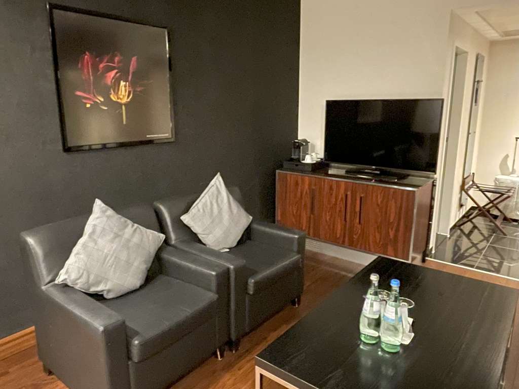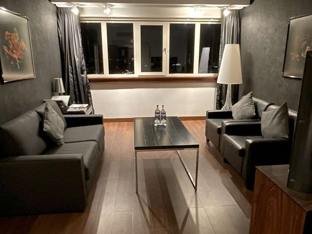 Das Wohnzimmer der One-Bedroom-Suite im Radisson Blu Hotel Hamburg punktet mit modernem, fast skandinavischem Design: Dunkle Holzböden, graue Wände und hochwertige Materialien wie Leder und Holz schaffen eine elegante Atmosphäre. Zwei bequeme graue Ledersofas stehen sich gegenüber, dazwischen ein schwarzer Couchtisch mit Metallgestell, auf dem zwei Flaschen Wasser und Gläser bereitstehen – ein nettes Willkommensdetail. Ein großes Kunstwerk setzt einen farbigen Akzent, während die stimmungsvolle Beleuchtung durch eine Stehlampe und Decken-Spots für Gemütlichkeit sorgt. Die großen Fenster bieten Aussicht auf den Park, das Congresszentrum und den hinteren Teil des Bahnhofs.
